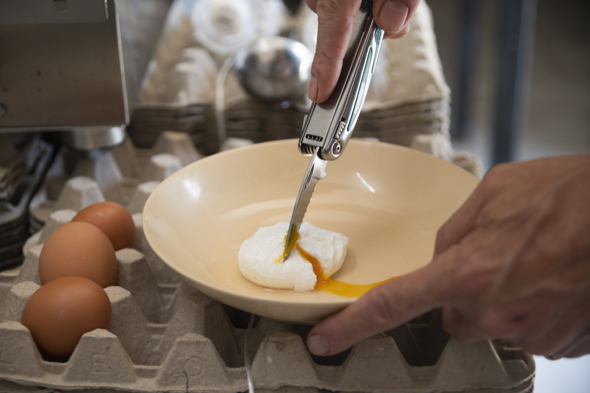 Για το ποσέ αυγό, χρειαζόμαστε νερό, αλάτι και ξύδι. Πριν βράσει το νερό, την ώρα που κάνει μόνο τις μπουρμπουλήθρες, κάνουμε μια ελαφριά δίνη και ρίχνουμε το αυγό. Εννοείται πώς θέλουμε το αυγό μαζεμένο, καλοσχηματισμένο εξωτερικά και στο εσωτερικό να είναι runny.