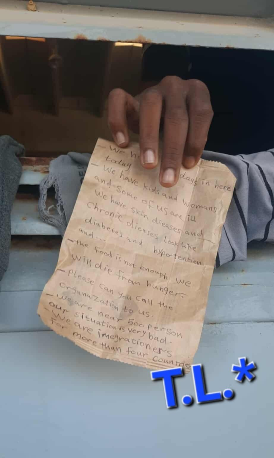 Χαρακτηριστικό της απόγνωσης των ανθρώπων που βρίσκονται εγκλωβισμένοι στην Αγυιά και το χειρόγραφο μήνυμα που έγραψε ένας από τους μετανάστες σε ένα κομμάτι χαρτί. Τα χέρια του απλώθηκαν μέσα από τις χαραμάδες του κτιρίου για να το δείξουν στον έξω κόσμο: