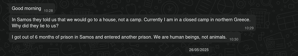 Μέσα από μηνύματα γεμάτα απόγνωση, ο 15χρονος Γιούσεφ, επικοινώνησε με την Human Rights Legal Project. “Μου είχαν πει ότι θα πάμε σε σπίτι (σ.σ. ξενώνα). Βγήκα από τη φυλακή της Σάμου μετά από έξι μήνες και είμαι ξανά στη φυλακή. Είμαστε άνθρωποι, όχι ζώα”, έγραφε στα μηνύματά του.