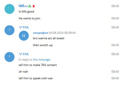 Στις 5 Ιουνίου 2024, ο Kills εκφράζει την επιθυμία του στον χρήστη Slain να στρατολογηθεί στην 764. Ο Kills προσφέρεται να παράγει περιεχόμενο με χαρακωμένα κορίτσια, αναφέροντας χαρακτηριστικά ότι «έχω τσούλες στη σειρά που θα έκαναν τα πάντα για εμένα».