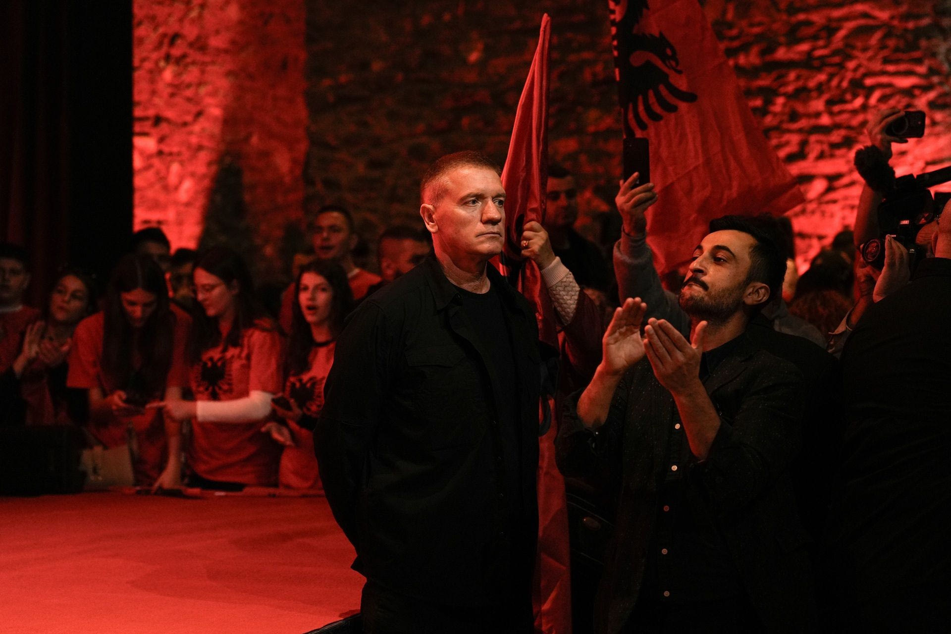 Μέσα στο χώρο της εκδήλωσης τώρα, αυτό που παρακολουθούμε είναι μια περφόρμανς με βάση το κόκκινο. Δεκάδες σημαίες με τον αλβανικό αετό, κόκκινα φούτερ, κόκκινα φουλάρια, κόκκινα γυαλιά. Κυρίες ντυμένες με παραδοσιακές στολές έχουν έρθει από την Αθήνα και χορεύουν.