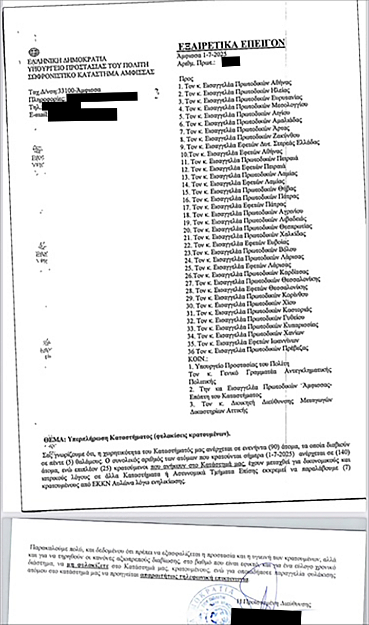Συγκεκριμένα, στο εσωτερικό έγγραφο αναφέρεται πως: “Η χωρητικότητα του Καταστήματός μας ανέρχεται σε 90 άτομα, τα οποία διαβιούν σε 5 θαλάμους. Ο συνολικός αριθμός των ατόμων που κρατούνται σήμερα (1-7-2025) ανέρχεται σε 140 άτομα, ενώ επιπλέον 25 κρατούμενοι που ανήκουν στο Κατάστημά μας έχουν μεταχθεί για δικονομικούς και ιατρικούς λόγους σε άλλα Καταστήματα ή Αστυνομικά Τμήματα. Επίσης, εκκρεμεί να παραλάβουμε 7 κρατούμενους από ΕΚΚΝ Αυλώνα, λόγω ενηλικίωσης.