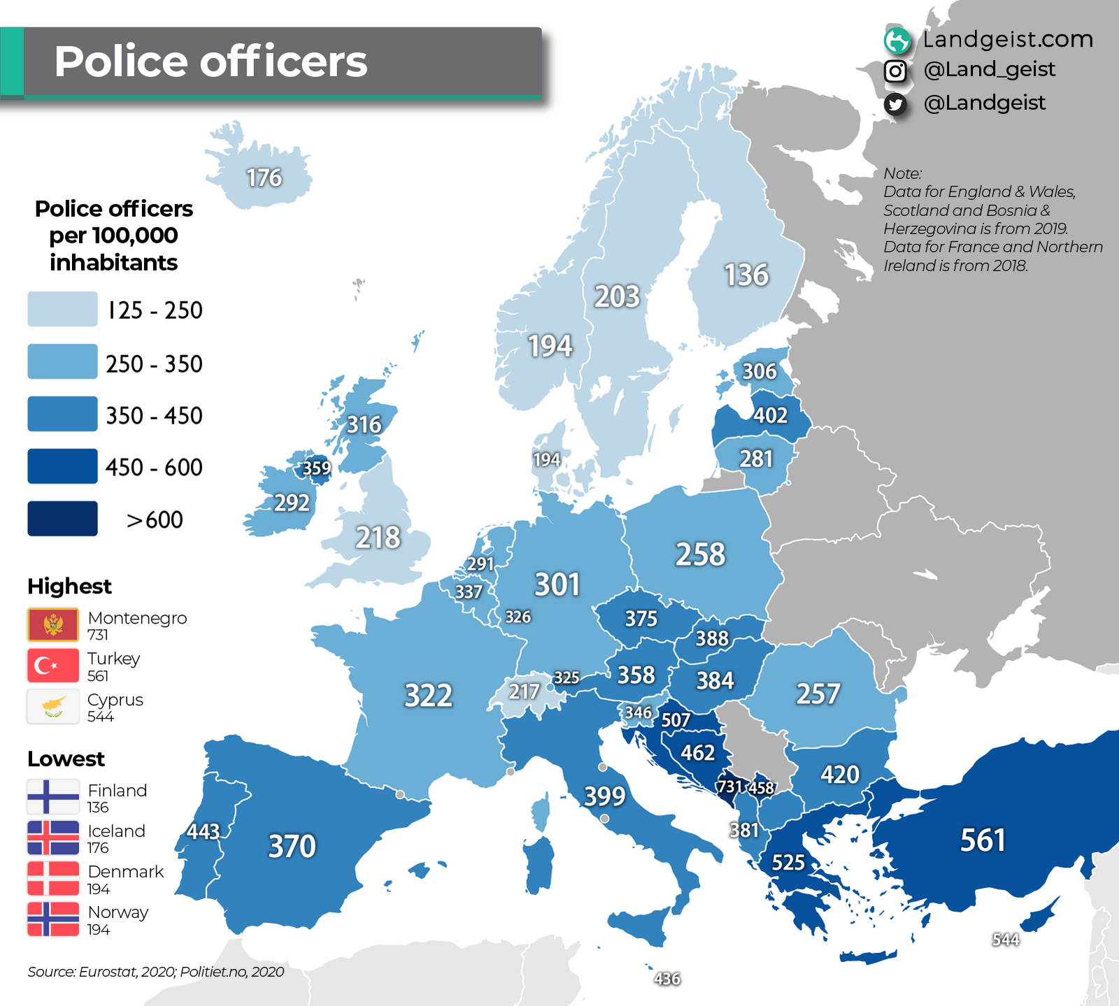 Στη Φινλανδία, την οποία είναι πηγή έμπνευσης για τους κυβερνώντες για τον στρατό και το εκπαιδευτικό σύστημα έχουν 136 αστυνομικούς ανά 100.000 κατοίκους.