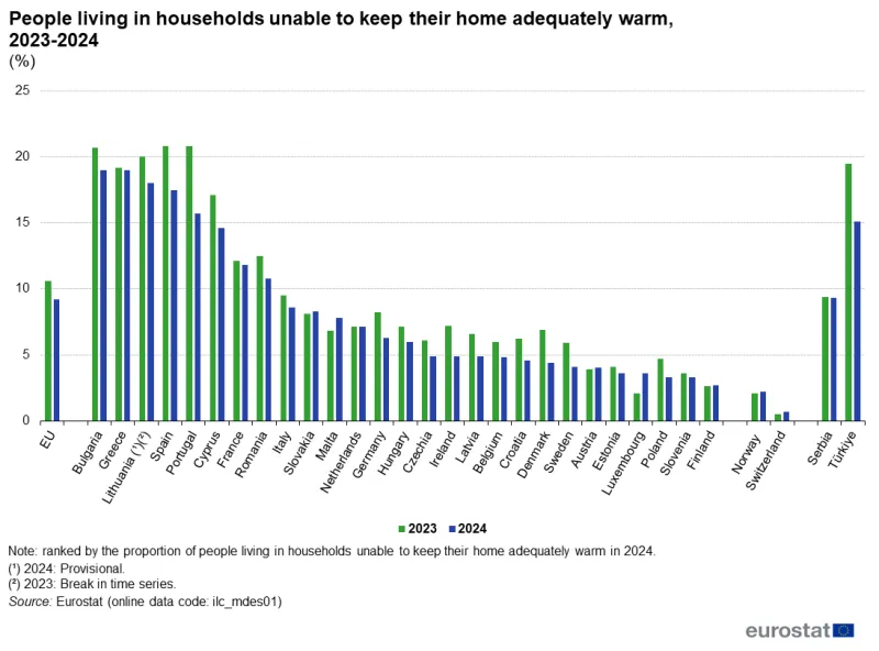Έχουμε και τη μεγαλύτερη αδυναμία θέρμανσης σπιτιού, με έναν στους 5 κατοίκους να έχουν πρόβλημα (ισοβαθμούμε με τη Βουλγαρία και απέχουμε περί τις 10 ποσοστιαίες μονάδες από τον μέσο όρο της ΕΕ).