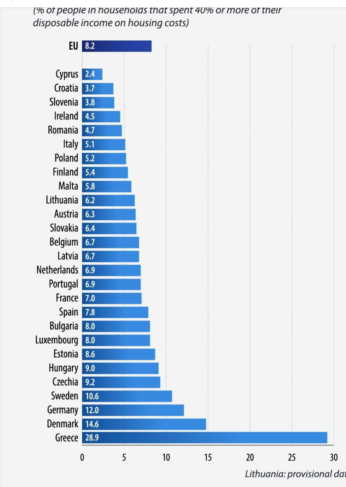 O κύριος Φερώνας σχολίασε ότι «μια σημαντική διάσταση του στεγαστικού ζητήματος, αφορά στη δαπάνη των νοικοκυριών για στέγαση. Σύμφωνα με τη Eurostat λοιπόν, το 2024, το 8.2 % των ανθρώπων στην ΕΕ ζούσαν σε νοικοκυριά, ξοδεύοντας το 40% ή περισσότερο του διαθέσιμου εισοδήματός τους για στέγαση.