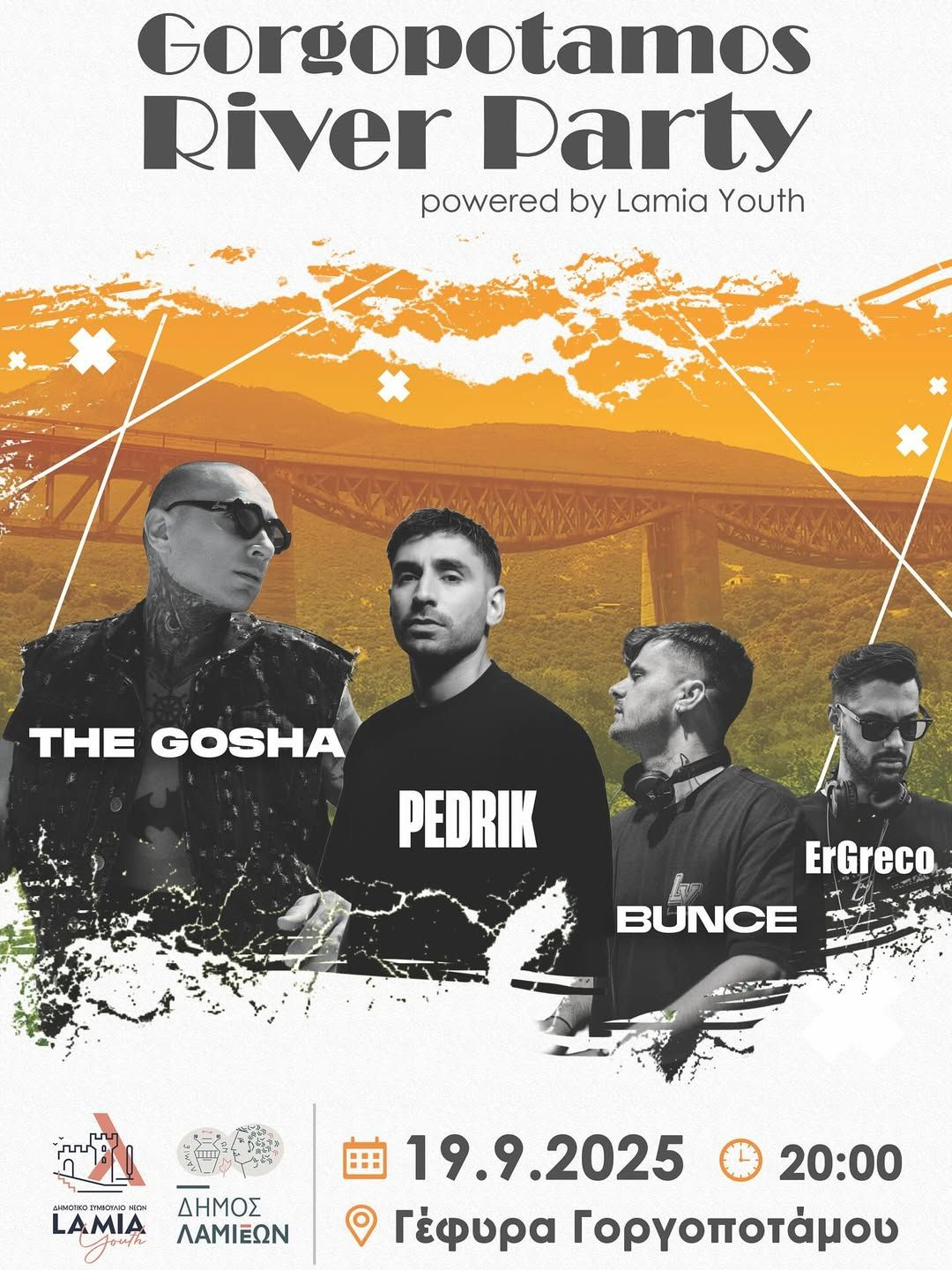 “Στις 19 Σεπτεμβρίου 2025 και ώρα 20:00 μ.μ. θα διεξαχθεί το πρώτο Gorgopotamos river party powered by Lamia Youth, στον πεζόδρομο κάτω από την ιστορική γέφυρα του Γοργοποτάμου” αναφέρουν οι διοργανωτές. Τέσσερις δημοφιλείς DJ “θα αναλάβουν τη μουσική της βραδιάς”. Street food, αναψυκτικά και ποτά θα παρέχονται από τοπικές επιχειρήσεις του Δήμου Λαμιέων.