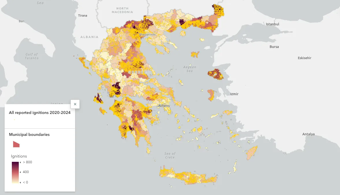 Από το 2020 έως το 2024 ήταν πίσω από 1.459 φωτιές στον Πύργο, 1.064 στην Καλαμάτα, 941 στο Αγρίνιο, 909 στη Μεσσήνη και 870 στην Πέλλα, μεταξύ άλλων.