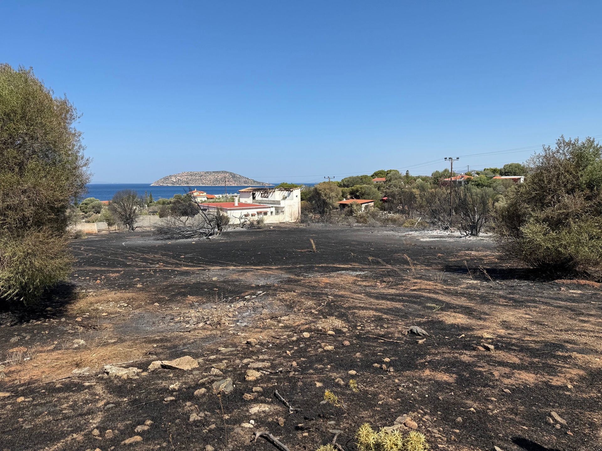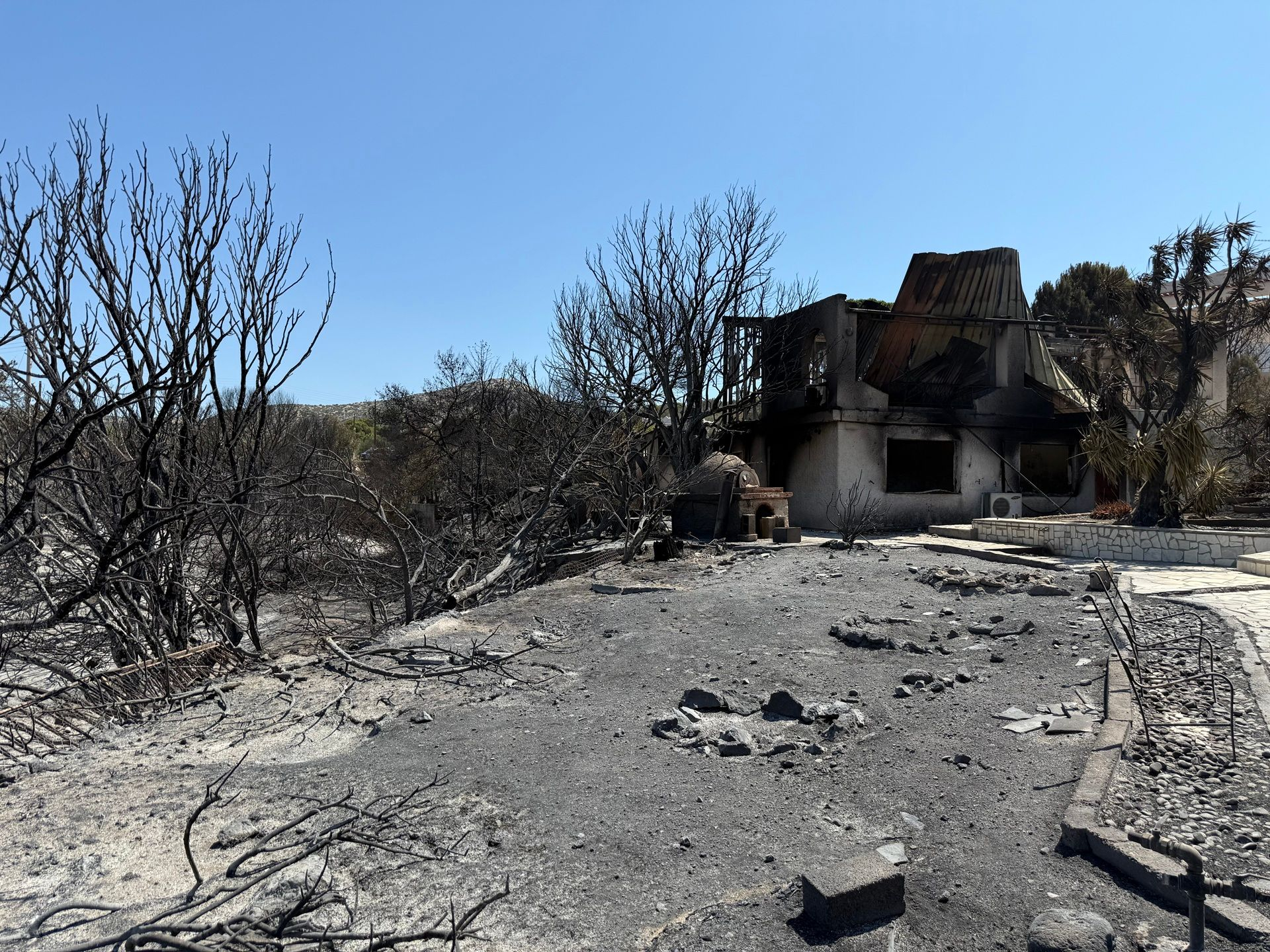 Χθες στις 12:35 λίγο πιο πέρα από το συγκεκριμένο σπίτι ήταν η πρώτη εστία της φωτιάς που έκαψε τον οικισμό Θυμάρι του Δήμου Σαρωνίδας, κοντά στην Παλαιά Φωκαία.