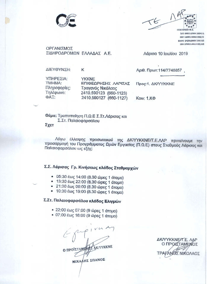 Η νυχτερινή βάρδια στο σταθμό της Λάρισας εκτελείται εδώ και χρόνια από έναν σταθμάρχη. Συγκεκριμένα, έγγραφο της Διεύθυνσης Κυκλοφορίας του ΟΣΕ πληροφορεί το Εφετείο Λάρισας ότι: «από το αρχείο που διατηρεί η Διεύθυνση μας προκύπτει ότι η νυχτερινή βάρδια στον ΣΣ Λάρισας διεξαγόταν με έναν Σταθμάρχη από το έτος 2015».