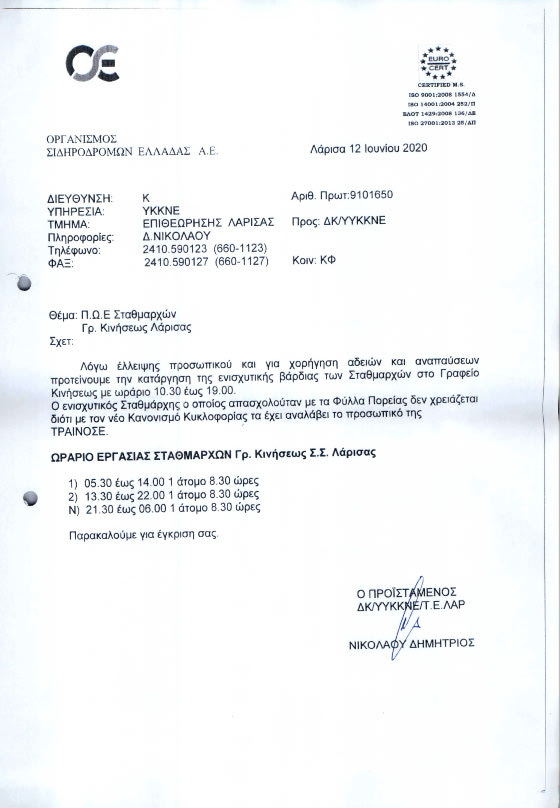 Παράλληλα, έγγραφα που εξασφάλισε το Magazine αποδεικνύουν ότι η τροποποίηση των βαρδιών, λόγω έλλειψης προσωπικού, είχε γίνει κανόνας. Συγκεκριμένα, σε τρία έγγραφα το 2015, 2019 και 2020 ο ΟΣΕ προτείνει για όλο το 24ωρο βάρδιες ενός ατόμου επί οκτώμισι ώρες.