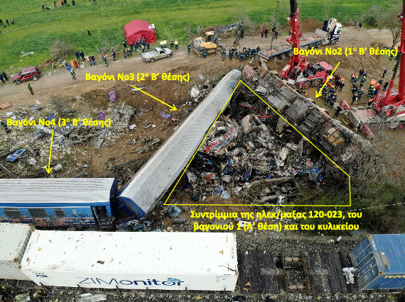 Κατάθεση του επιζήσαντα, Παρασκευά Καλαβρυτινού, ενώπιον του ανακριτή τον Ιούνιο του 2023, υποστηρίζει επίσης την παραπάνω εικόνα. Συγκεκριμένα, αναφέρει ότι εντόπισαν εστία φωτιάς και άκουγαν φωνές μεταξύ του βαγονιού 2 και της εμπορικής αμαξοστοιχίας: