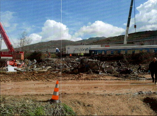 Μόλις ξημέρωσε, ήρθαν τρεις γερανοί για να ανασηκώσουν το βαγόνι αναζητώντας αγνοούμενους. Στο σημείο αυτό, ο μάρτυρας καταθέτει ότι έριξαν κάποια χαλίκια, επειδή βούλιαζε το έδαφος, προκειμένου να παραμείνουν σταθεροί οι γερανοί.