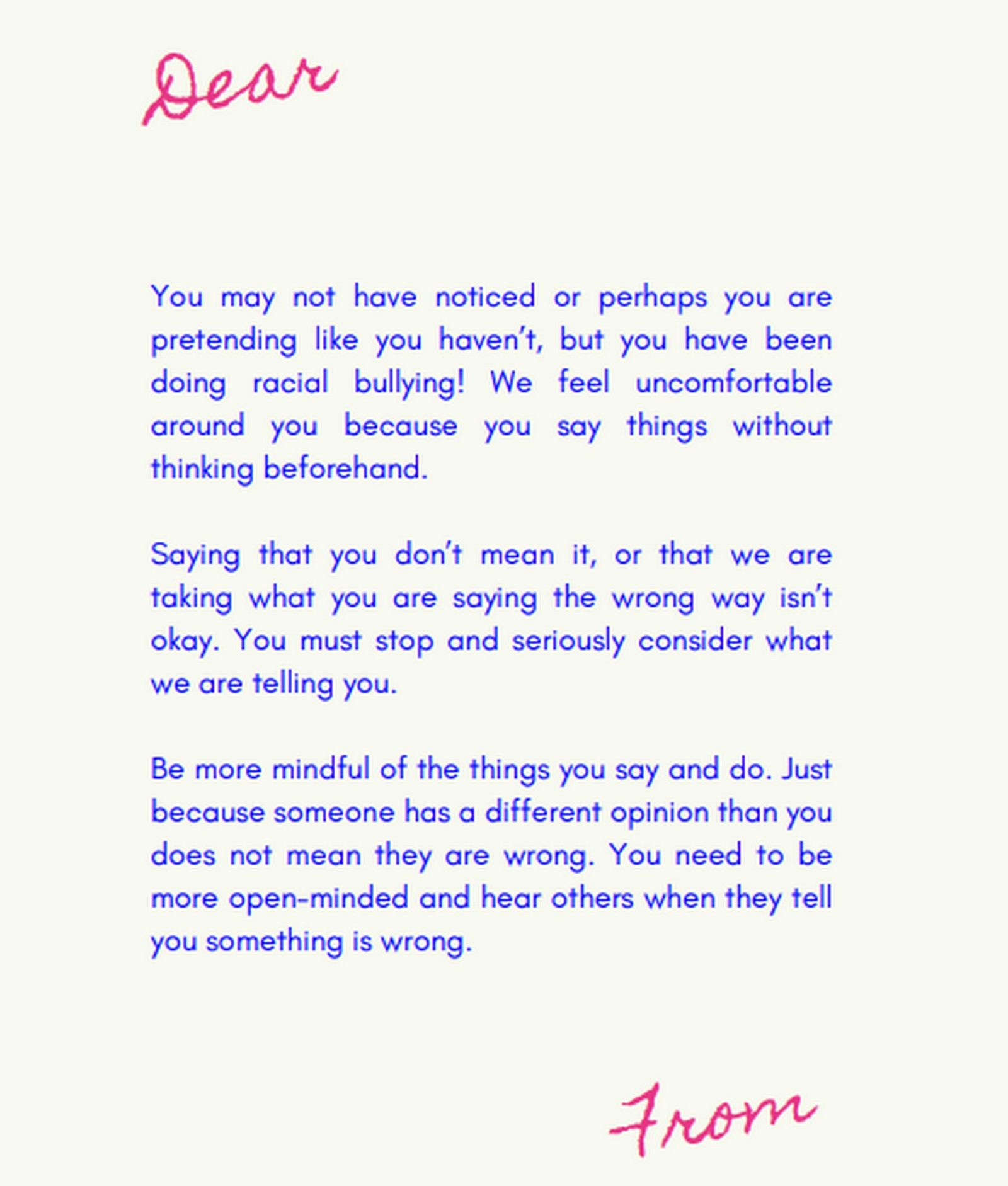 Νομίζω λοιπόν, πως τα σχολεία είναι είναι τα μέρη όπου συμβαίνει το μεγαλύτερο μέρος αυτής της πραγματικότητας (ρατσιστική βία, υποτιμητικοί όροι, παρενόχληση, προκαταλήψεις), με τους δασκάλους να είναι υπεύθυνοι, όταν χρησιμοποιούν ως πρόσχημα πως η προσβολή ήταν ένα αστείο που έκανε το όποιο παιδί.