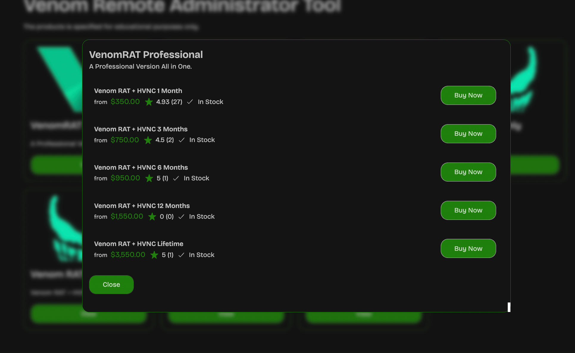 Η έκδοση με HVNC, όμως, πάει ένα βήμα παραπέρα και αυξάνει το κόστος ενοικίασης του λογισμικού σε $350 το μηνιαίο πακέτο, $1.550 το ετήσιο και η λιγότερο δημοφιλής επιλογή της αγοράς του λογισμικού «για πάντα» στα $3.550. Το τελευταίο και ακριβότερο πακέτο έχει μία πεντάστερη κριτική. Το πιο δημοφιλές προϊόν της πλατφόρμας είναι το πακέτο Venom RAT + HVNC, το οποίο συγκεντρώνει βαθμολογία 4,93/5 από 27 αξιολογήσεις.