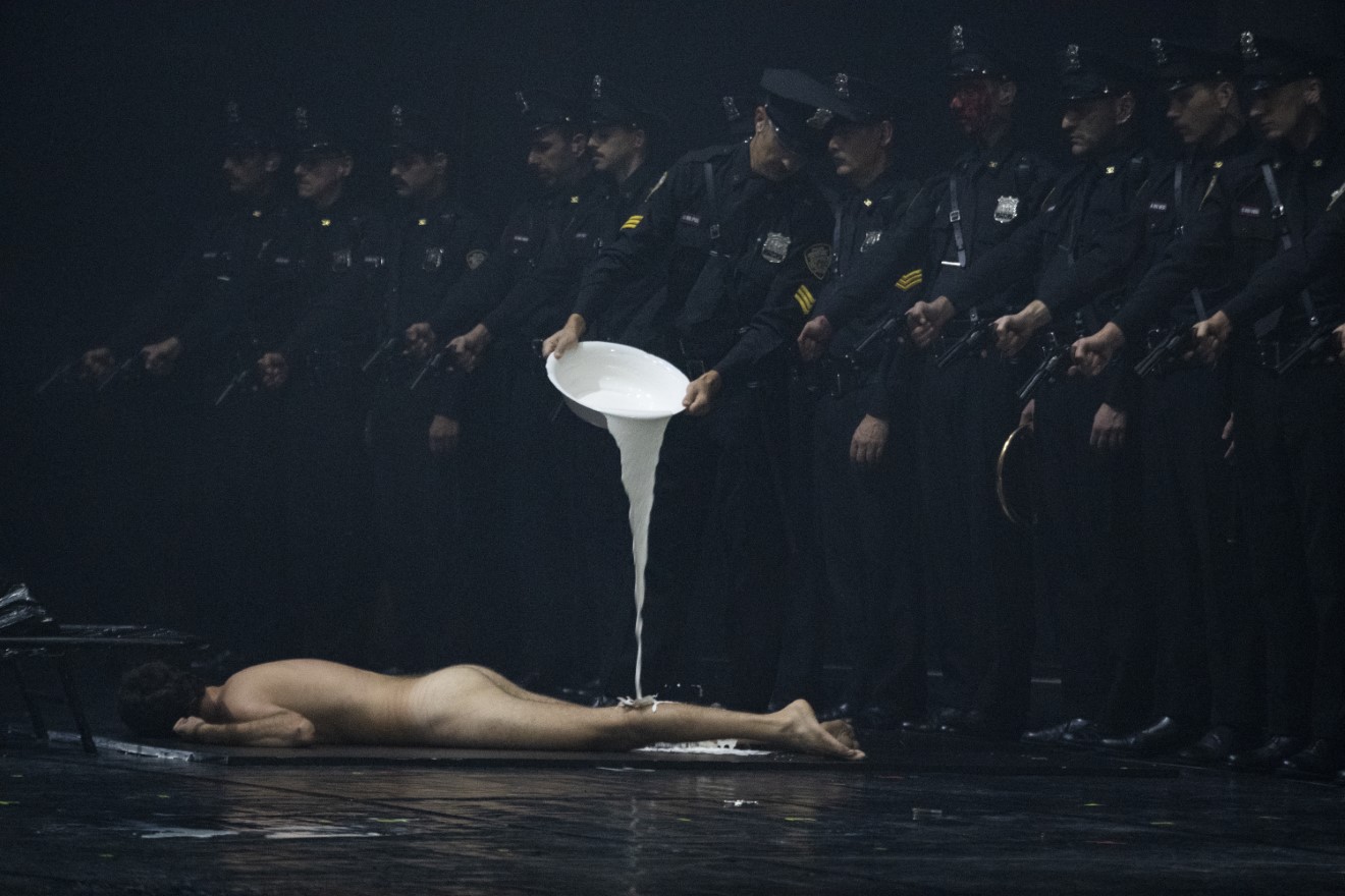 “Πάρα πολλές. Παντού στην Αμερική, τη Γαλλία ακόμη και στην Ελλάδα γίνονται διαρκώς συζητήσεις για τη βία” εξηγεί ο σπουδαίος σκηνοθέτης. “Πιθανώς το ξεκίνημα αυτού του πρότζεκτ έγινε όταν ήμουν στο Παρίσι και τότε υπήρχε παντού αστυνομία. Δεν είναι όμως η παράσταση μία απομίμηση, είναι κάτι πιο αφαιρετικό και πιο βαθύ. Δεν αποτελεί ούτε απάντηση ούτε κριτική σε όλο αυτό. Και γι αυτό δεν υπάρχουν λέξεις σε αυτην. Μόνο κάποιες διάσπαρτες σε πανό γραμμένες στα λατινικά, σε μια γλώσσα νεκρή δηλαδή. Υπάρχει ένα μυστήριο διάχυτο”.