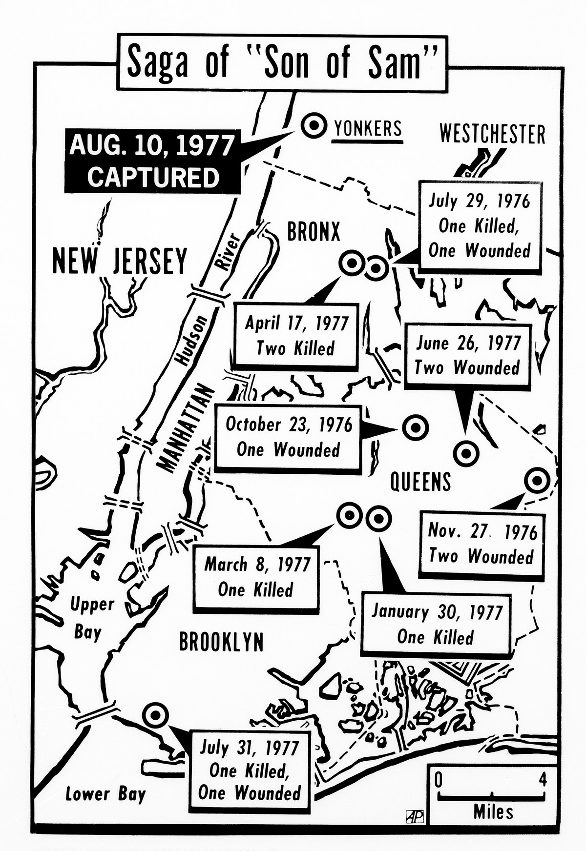 O serial killer ‘χτύπησε’ για πρώτη φορά στο Μπρούκλιν στις 31/7 του 1977 -θύμα για πρώτη φορά ήταν μια ξανθιά γυναίκα-, ένα χρόνο και δυο μέρες μετά το θάνατο του -και ενώ όλος ο πληθυσμός της Νέας Υόρκης απαιτούσε τη σύλληψη του. Οι αρχές έλεγαν πως αυτή δεν θα μπορούσε παρά να είναι προϊόν λάθος ή/και τύχης. Τα σκίτσα έγιναν πέντε, οι διαφορές παρέμεναν κραυγαλέες και οι πληροφορίες ανέφεραν την ύπαρξη ενός κίτρινου Volkswagen, όπου εμφανιζόταν ο ‘Son of Sam’. Οκτώ μέρες μετά ένας αστυνομικός ανέλαβε την αποστολή να τσεκάρει τις κλήσεις που είχαν κοπεί σε αυτοκίνητα της περιοχής της τελευταίας δολοφονίας, ανήμερα του εγκλήματος. Ανακάλυψε μια που είχε το όνομα ‘Ντέιβιντ Μπέργκοβιτς’ και ως τόπο κατοικίας το Γιόνκερς -περιοχή της Νέας Υόρκης μια ώρα με το αυτοκίνητο από το Μπρούκλιν.