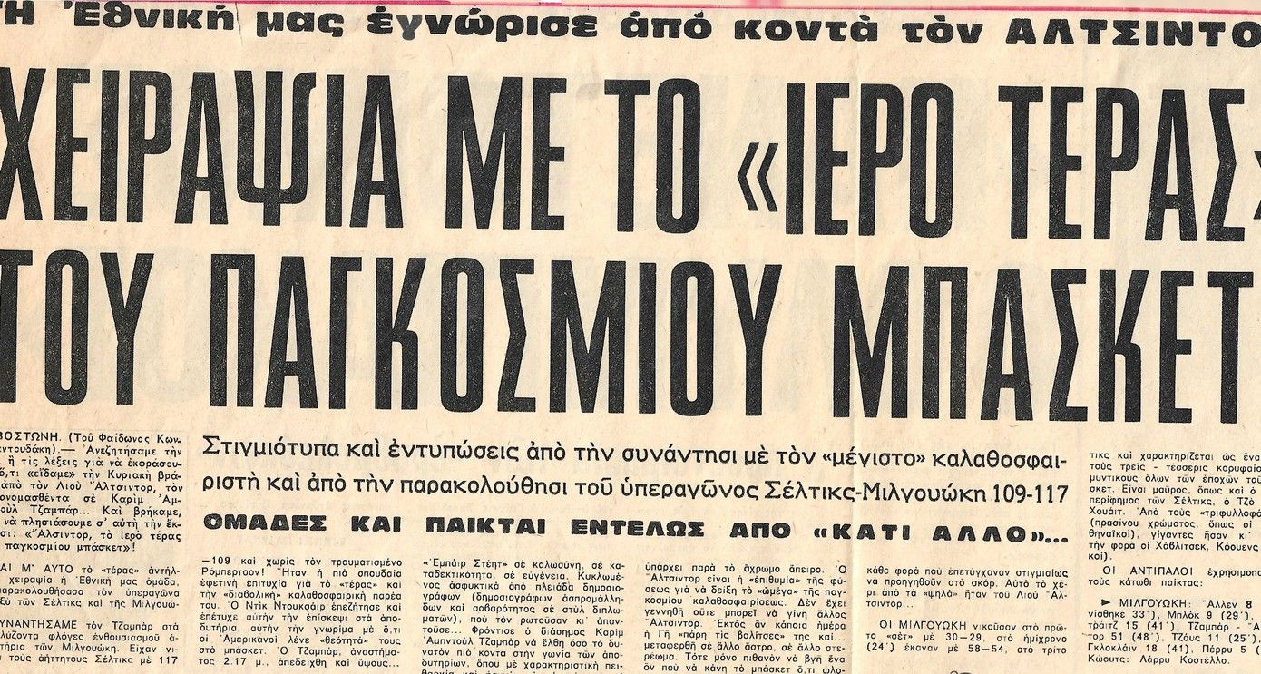 Ο Ρίτσαρντ Ντουκσάιρ, που είχε αναλάβει την τεχνική ηγεσία της Εθνικής, πήγε την ομάδα στη Βοστώνη με αγώνες εναντίον κολεγίων αλλά και παρακολούθηση δυο ματς ΝΒΑ. Στο θρυλικό Μπόστον Γκάρντεν, όπου το αντιπροσωπευτικό μας συγκρότημα έπαιξε εναντίον του Μπόστον Κόλετζ, όλη η αποστολή είδε το παιχνίδι, ανάμεσα στους Σέλτικς και τους (πρωταθλητές το 1971) Μιλγουόκι Μπακς του μυθικού Λιου Άλντσιντορ. Δηλαδή του Καρίμ Αμπντούλ Τζαμπάρ!