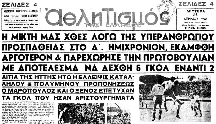 Η εφημερίδα “Αθλητισμός” στο φύλλο της 22/4/1948 προαναγγέλλει το μεγάλο ματς με μια φωτογραφία της Εθνικής στην οποία έπαιζαν Μαρόπουλος, Βικελίδης, Βάζος, Ξένος, Μουράτης και οι άλλοι αστέρες της εποχής.