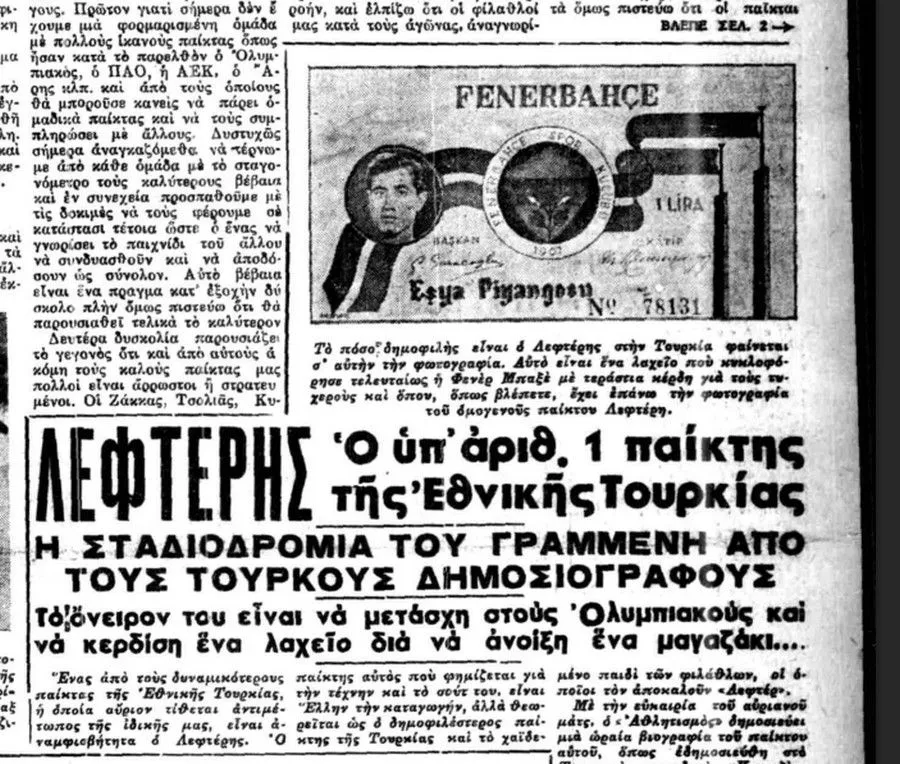 Ο “Αθλητισμός” φιλοξενεί και ένα πορτρέτο του Λεφτέρ με τίτλο “ΛΕΦΤΕΡΗΣ ο υπ’ αριθμόν 1 παίκτης της Εθνικής Τουρκίας”.