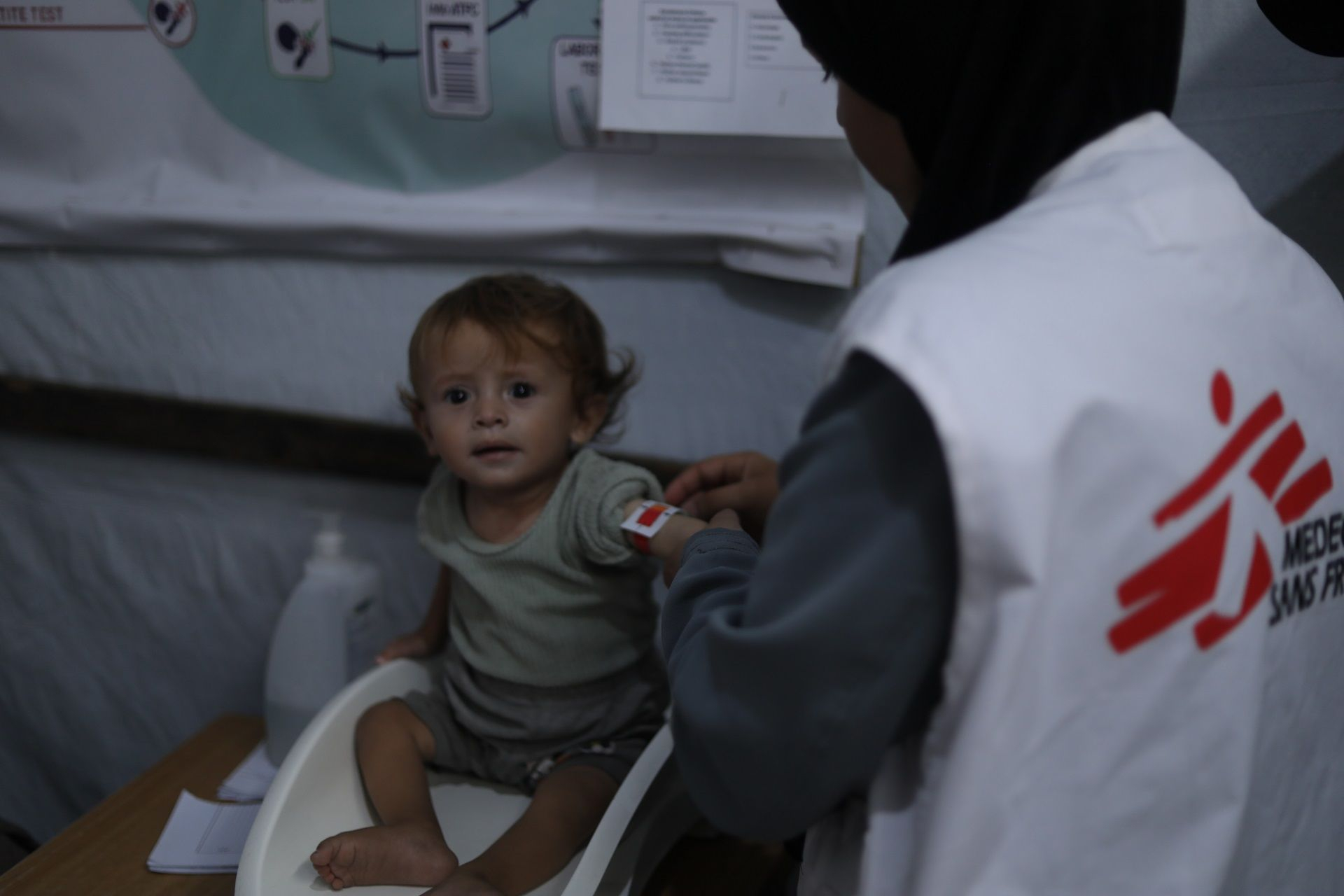 Η οκτάμηνη Νουρ Αλ-Σάερ, η οποία πάσχει από σοβαρό υποσιτισμό, εξετάζεται από νοσοκόμα των Γιατρών Χωρίς Σύνορα. Nour Alsaqqa / MSF