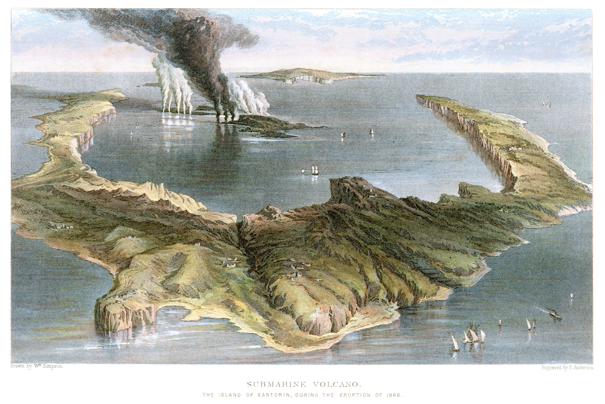 Θήρα – Θηρασιά – Ασπρονήσι. Τρία νησιά στ’ ακρόχειλα μιας γιγάντιας χοάνης. Απομεινάρια στεριανά του ηφαίστειου θόλου της αρχαίας Στρογγύλης. Σαντορίνη νοματίζουμε σήμερα το ηφαιστειακό πλάσμα, το γέννημα της γαίας, του ήλιου και των ανθρώπων…*