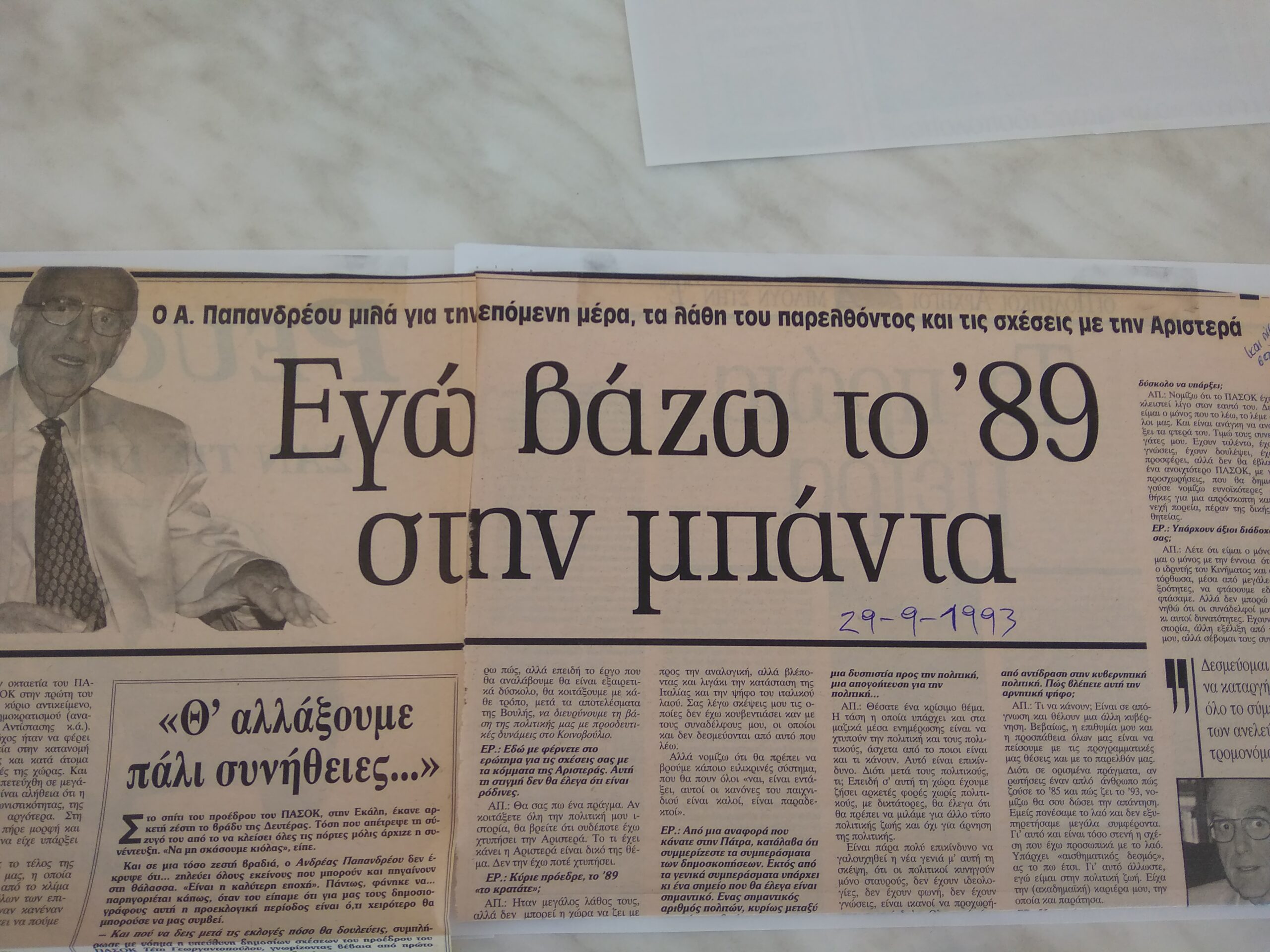 Εδώ είναι η ειδοποιός διαφορά του σήμερα με τη δεκαετία του ’80. Τότε θα ήταν αδιανόητο ακόμα και να σκεφθεί κανείς να σκεφθεί το ενδεχόμενο το ΠΑΣΟΚ να συγκυβερνήσει με τη ΝΔ. Ακόμα και μετά την πολιτική θύελλα του ’89, όταν η ΝΔ και ο ενιαίος Συνασπισμός παρέπεμψαν τον Ανδρέα Παπανδρέου στο Ειδικό Δικαστήριο, ο Ανδρέας έκανε «μονομέτωπο»(κατά της ΝΔ) αγώνα. Γνώριζε ότι για να επανέλθει στην κυβέρνηση χρειαζόταν να πάρει μαζί του και μεγάλο κομμάτι της ευρείας Αριστεράς. Και το κατάφερε πάλι στις εκλογές του 1993. Λίγο πριν γίνουν oι εκλογές αυτές, σε συνέντευξη που μου είχε δώσει για την «Ελευθεροτυπία», είχε πει χαρακτηριστικά: «Εγώ βάζω το ’89 στην μπάντα».
