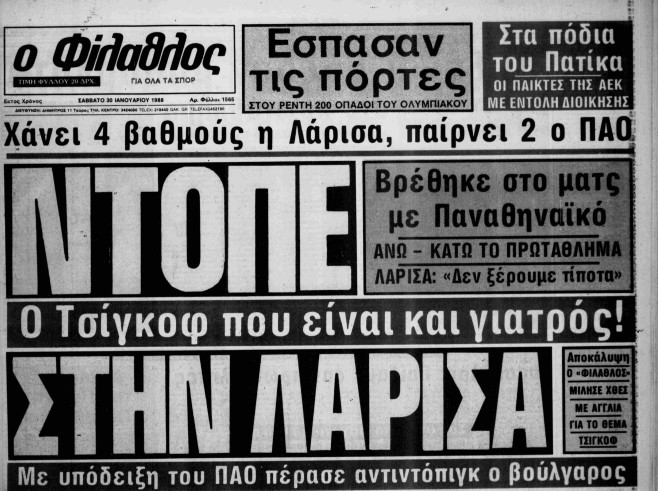 Προφανώς τυπικό ντοπάρισμα δεν υπάρχει και το άρθρο 32 απειλούσε σοβαρά τη Λάρισα. Ο Παναθηναϊκός ρίχνει λάδι στη φωτιά, αφήνοντας να εννοηθεί ότι “κάτι ήξερε” για την περίπτωση Τσίγκοφ. Εκ του αποτελέσματος “μαγκιά”, ρεπορτάζ φαντασίας; Ποιος ξέρει. Ο τίτλος πάντως Ντοπέ ο Τσίγκοφ που είναι και γιατρός, έχει περάσει στην ιστορία γιατί ο πρώην ποδοσφαιριστής δεν ξέρουμε τι σπούδασε, πάντως στα 61 του χρόνια, πλέον, εργάζεται σαν … τελωνειακός στα σύνορα της Ελλάδας με τη Βουλγαρία.