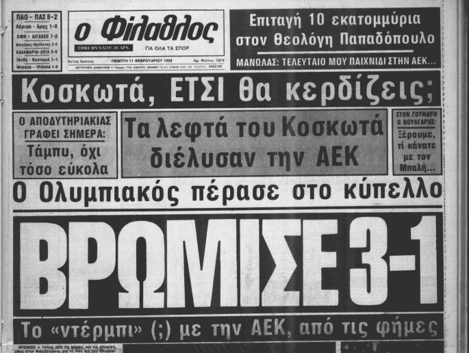 Η σεζόν 1987-88 μπορεί να είναι και η πιο συναρπαστική που είδαμε ποτέ στα ελληνικά γήπεδα. Μέχρι να ολοκληρωθεί ο Γιώργος Κοσκωτάς είχε αλώσει το ποδόσφαιρο, οι αδερφοί Βαρδινογιάννη είχαν κατηγορηθεί για ξυλοδαρμό στα επίσημα του ΟΑΚΑ και η ΑΕΚ κατήγγειλε απόπειρα δωροδοκίας στον αγώνα Κυπέλλου με τον Ολυμπιακό. Ο δε τελικός του Κυπέλλου ανάμεσα σε Παναθηναϊκός και Ολυμπιακό, που κρίθηκε στα πέναλτι, υπέρ του ΠΑΟ, με τον Νίκο Σαργκάνη να φωνάζει “πρόεδρε τους τα έχωσα στον κ….” πέρασε στην ιστορία σαν το ντέρμπι του μίσους.