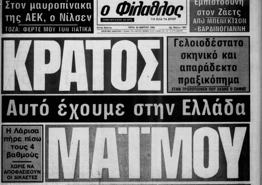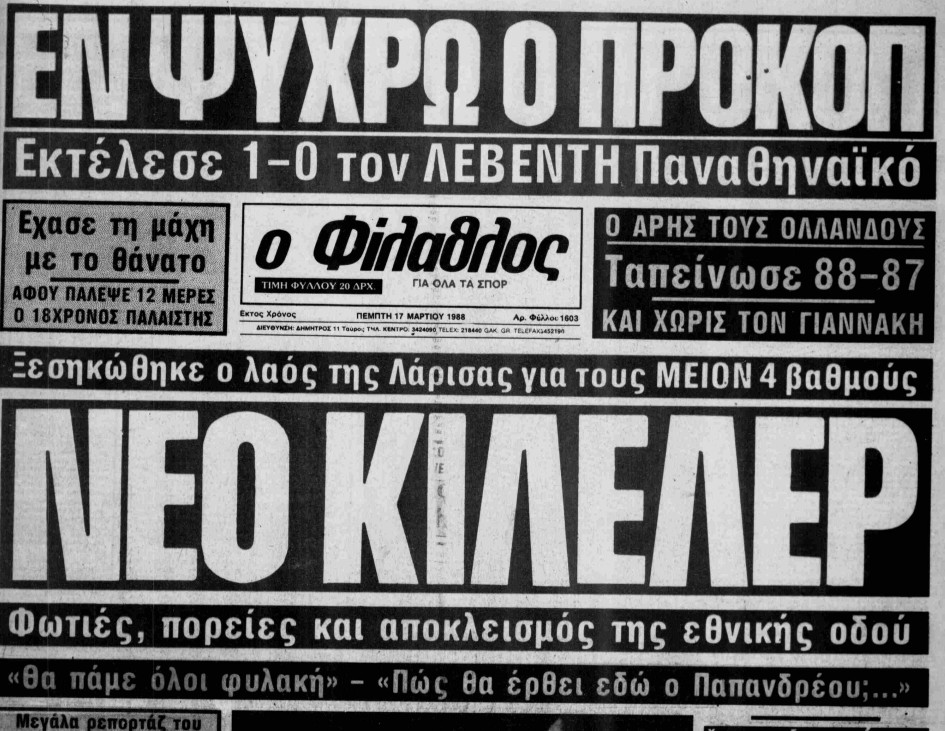 Σαν σήμερα 16 Μαρτίου του 1988, η πρωτόδικη απόφαση για την αφαίρεση 4β, είχε βγάλει όλη τη Λάρισα στους δρόμους. Πέντε μέρες αργότερα η κυβέρνηση Παπανδρέου έκανε ντρίπλα αλά Καραπιάλη. Οι Λαρισαίοι, που θυμούνται εκείνες τις μέρες ως το “αθλητικό Κιλελέρ” της Θεσσαλίας, είχαν πετύχει τον στόχο τους. Αυτή την ιστορία, με τη βοήθεια των πρωτοσέλιδων και των ρεπορτάζ της εφημερίδας “Φίλαθλος”, θα θυμηθούμε μαζί.