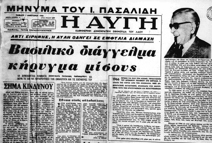 Στους κύκλους μας -και όχι μόνο σ’ αυτούς- το πρωτοχρονιάτικο διάγγελμα με το γεμάτο μεσαιωνική αδιαλλαξία κήρυγμά του, κρίνεται σαν αντιδημοκρατικό και ανελεύθερο. Οι γνώμες περί μιάσματος που εκφράζονται σ’ αυτό το διάγγελμα είναι εκτός τόπου και χρόνου” σημειώνεται στο κείμενο, που δημοσιεύτηκε στο περιοδικό “Επιθεώρηση Τέχνης” (τεύχος Γενάρη, Φλεβάρη, 1966)