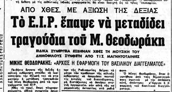 Ο Χρήστος Λεοντής, που συνεργάζεται με το ΕΙΡ, δηλώνει ότι αρνείται να υπακούσει στις εντολές και να μην παίξει τραγούδια του Μίκη και παραιτείται. Ο “νεαρός τραγουδοποιός” όπως τον αναφέρουν οι εφημερίδες της εποχής, Διονύσης Σαββόπουλος, λίγο πριν ξεκινήσει η συναυλία του στο θέατρο Αλάμπρα, μπροστά σε 2.000 θεατές, δηλώνει: “Τον Θεοδωράκη τον απαγόρευσαν κι εγώ δεν μπορώ να κάνω τίποτε άλλο παρά να φωνάξω και να τραγουδήσω!”