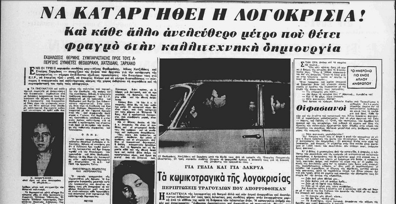 Τελευταία αυτή η περίφημη λογοκρισία έφτασε στο σημείο να κόβη τραγούδια για να περιφρουρήση το αισθητήριο του ελληνικού λαού, ενώ άφηνε να περνούν τραγούδια σαν “Τον Κένεντι τον φάγανε οι άτιμοι” και σαν το “Εγώ δεν είμαι σαν τους Μπητλς”.