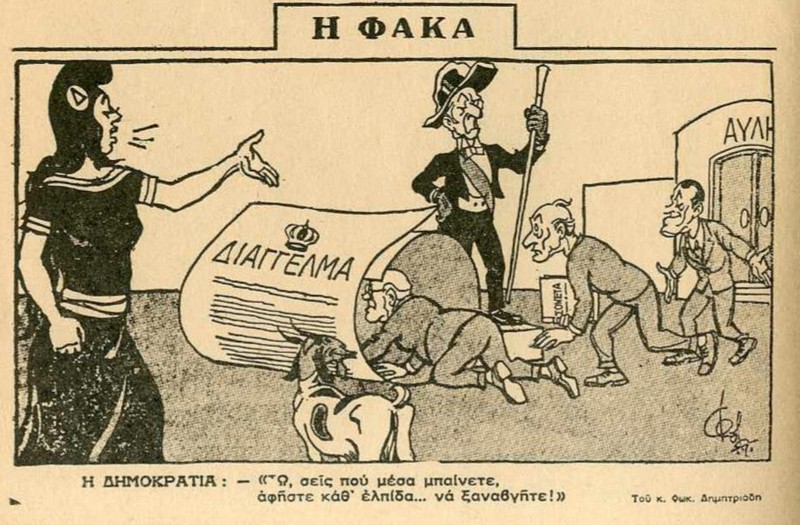 Στο ίδιο πνεύμα και οι γελοιογράφοι που απέδιδαν το πνεύμα των ημερών με τον δικό τους ξεχωριστό τρόπο. Ο Φωκίων Δημητριάδης των «Νέων» προειδοποιεί όσους πολιτικούς δεν εναντιώθηκαν στο διάγγελμα (Στασινόπουλος, Κανελλόπουλος, Μαρκεζίνης) ότι πέφτουν στη φάκα του Βασιλέα