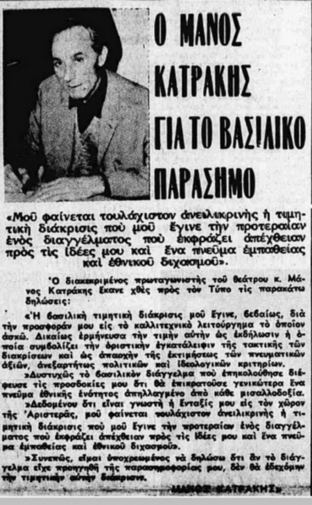 Γραπτή δήλωση είχε κάνει στον Τύπο και ο Μάνος Κατράκης, που πρόσφατα είχε βραβευτεί με τη βασιλική τιμητική διάκριση: “Δικαίως ερμήνευσα την τιμήν αυτήν ως εκδήλωσιν, η οποία συμβολίζει την οριστική εγκατάλειψιν της τακτικής των διακρίσεων και ως απαρχήν της εκτιμήσεως των πνευματικών αξιών, ανεξαρτήτως πολιτικών και ιδεολογικών κριτηρίων.