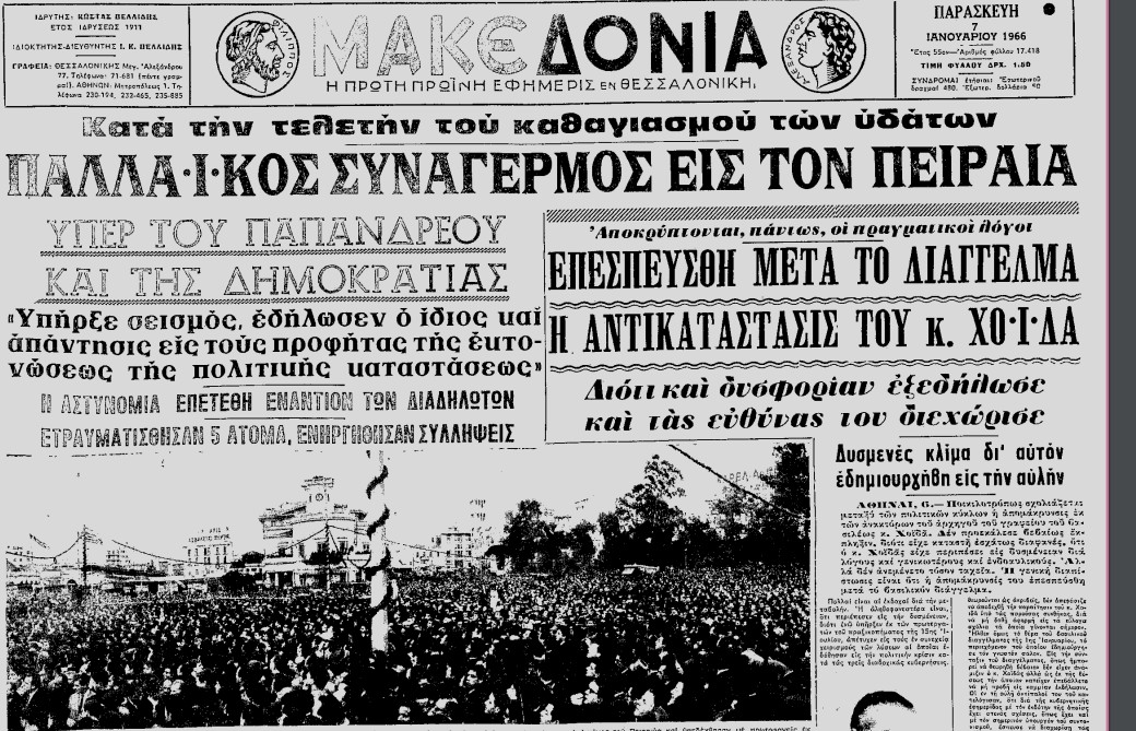 Κι η πρώτη αντίδραση έρχεται στον εορτασμό των Θεοφανίων στον Πειραιά, όταν οι βασιλείς και η κυβέρνηση διαλέγουν το Πασαλιμάνι, ενώ η Ε.Κ – με επικεφαλής τον Γ.Παπανδρέου- και η ΕΔΑ πηγαίνουν στο Δημαρχείο.