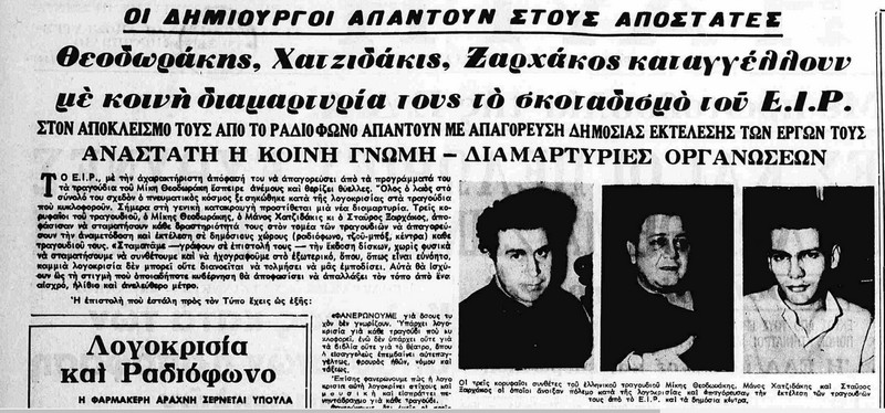 Σύσσωμοι οι δημιουργοί, αλλά και οι άνθρωποι της τέχνης γενικότερα, με αφορμή την απαγόρευση του ΕΙΡ, έρχονται σε πλήρη αντιπαράθεση με την κυβέρνηση. Στις 27 Ιανουαρίου με κοινή τους επιστολή διαμαρτυρίας Μίκης Θεοδωράκης, Μάνος Χατζιδάκις και Σταύρος Ξαρχάκος, προκαλούν σεισμό. Οι δυο κορυφαίοι συνθέτες και ο “διάδοχος” τους, καταγγέλλουν την λογοκρισία και ανακοινώνουν ότι απαγορεύουν την εκτέλεση των έργων τους από το ραδιόφωνο και λοιπούς δημόσιους χώρους (κέντρα διασκέδασης, τζουκ-μποξ κλπ