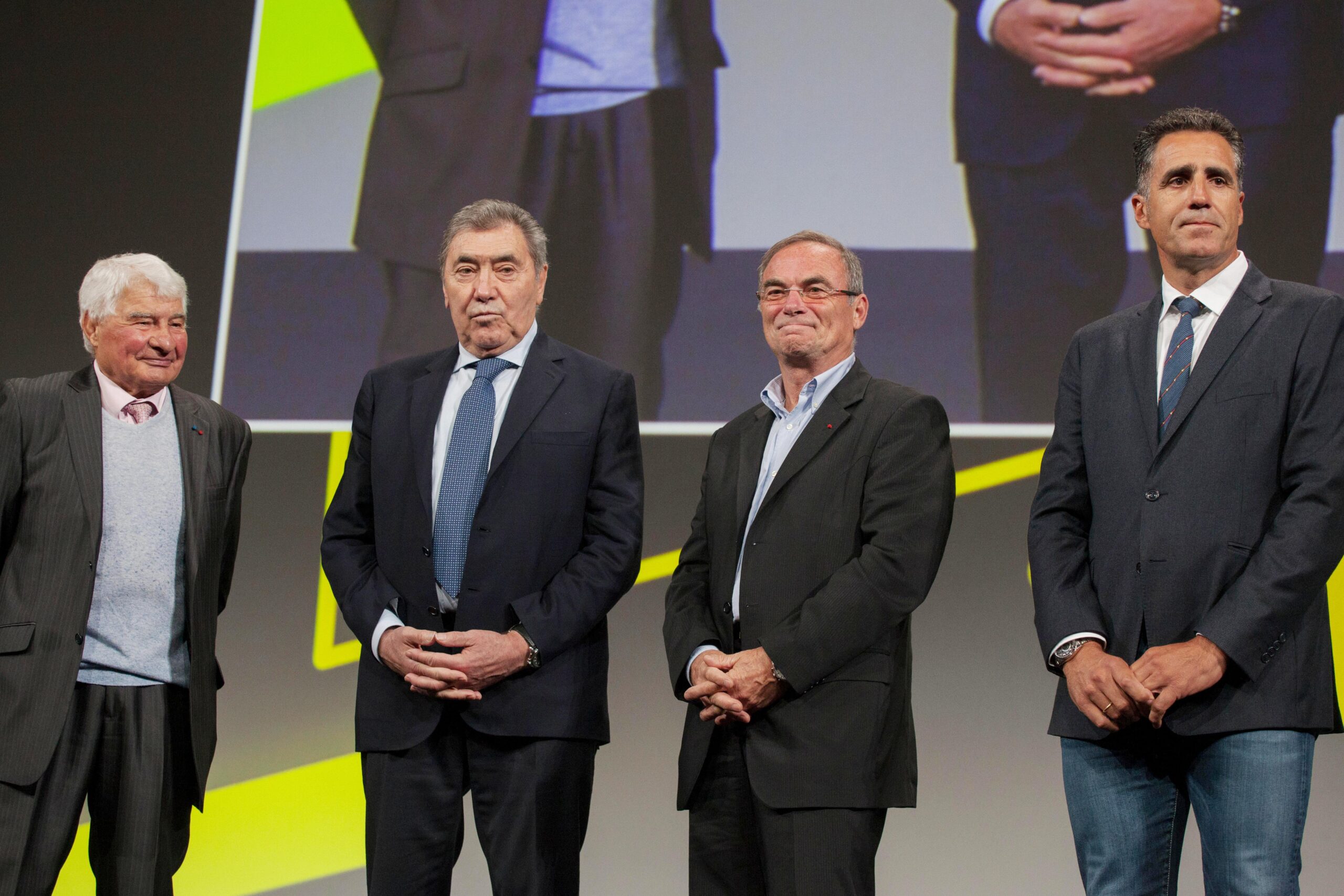 Τρίτος από αριστερά, ο Μπερνάρ Ινό, με 10 μεγάλους Γύρους στη συλλογή του (5 Γαλλίας, 3 Ιταλίας και 2 Ισπανίας), ο τελευταίος Γάλλος που κέρδισε το Tour (1985). Τέταρτος από αριστερά, ο Ισπανός Μιγκέλ Ιντουράιν, με 5 Γύρους Γαλλίας και 2 Ιταλίας, ο μοναδικός αθλητής που έχει κερδίσει το Tour πέντε συνεχόμενες φορές. Απουσιάζει ο τέταρτος με 5 νίκες στο Tour, ο Γάλλος Ζακ Ανκετίλ (ο πρώτος που το πέτυχε). Ο πρώτος από αριστερά, είναι ο Γάλλος Ρεμόν Πουλιντόρ, ο θρυλικός “Πουπού”, ο “αιώνιος δεύτερος”, ο άνθρωπος που ανέβηκε 8 φορές στο βάθρο του Tour (3 φορές 2ος και 5 φορές 3ος), αλλά δεν κατάφερε ποτέ να το κερδίσει, αφού είχε την ατυχία να πέσει πρώτα πάνω στον Ανκετίλ και στη συνέχεια, στον Μερξ.
