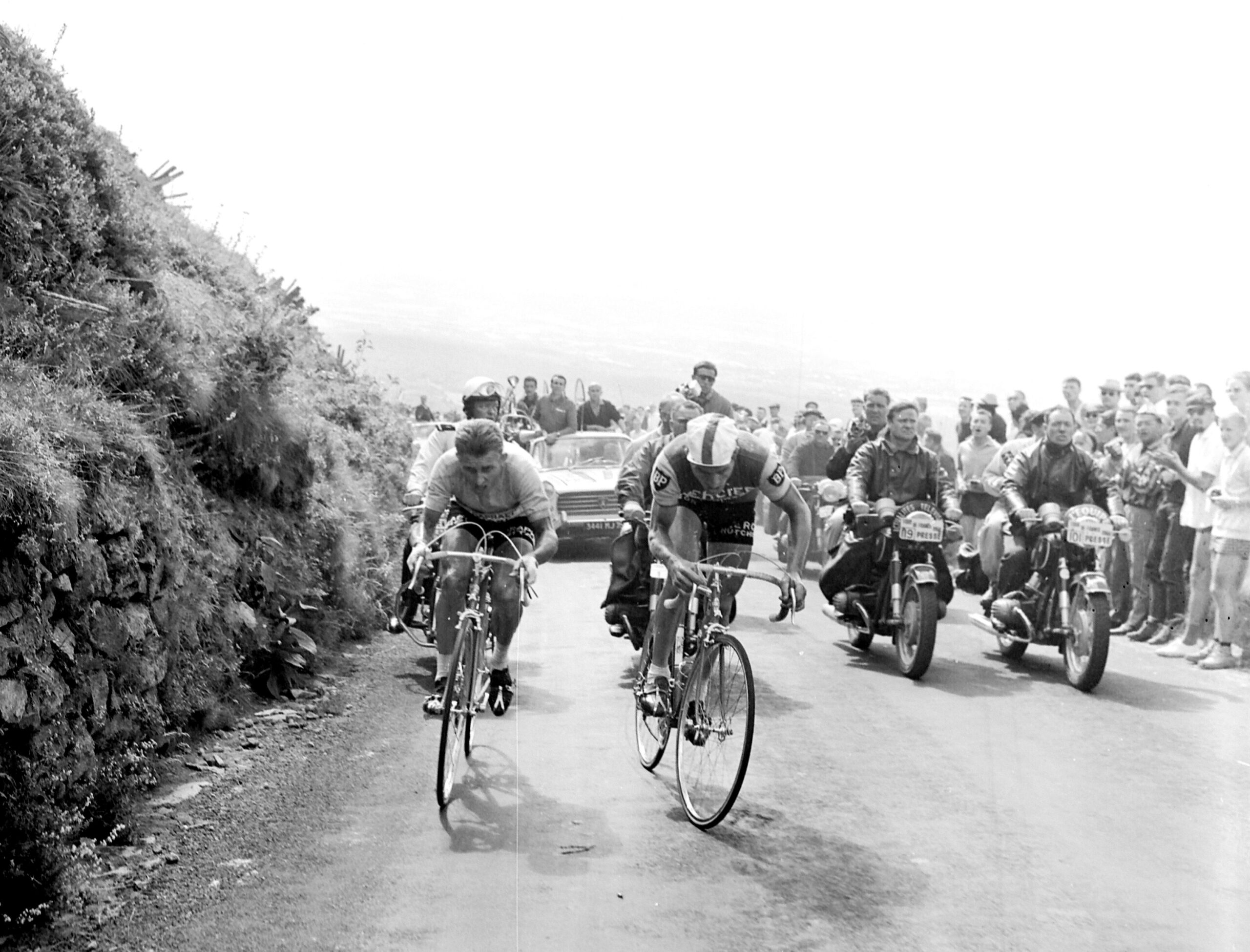 Εδώ βλέπουμε μια από τις πιο ιστορικές φωτογραφίες σε ολόκληρη την πορεία του Tour de France. Βρισκόμαστε στη διοργάνωση του 1964, με μεγάλους πρωταγωνιστές δυο Γάλλους, τον Ζακ Ανκετίλ (νικητή τότε ήδη τέσσερις φορές του Γύρου Γαλλίας) και τον Ρεμόν Πουλιντόρ. Ο πρώτος είχε το παρατσούκλι “Monsieur Chrono” λόγω των εξαιρετικών του επιδόσεων στο χρονόμετρο, ο δεύτερος ήταν γνωστός με το χαϊδευτικό “Poupou”. Ο Πουλιντόρ, όπως γράψαμε και πιο πάνω, ανέβηκε 8 φορές στο βάθρο του Tour, αλλά δεν κέρδισε ποτέ τον αγώνα (κατέκτησε το 1964 τον Γύρο Ισπανίας).