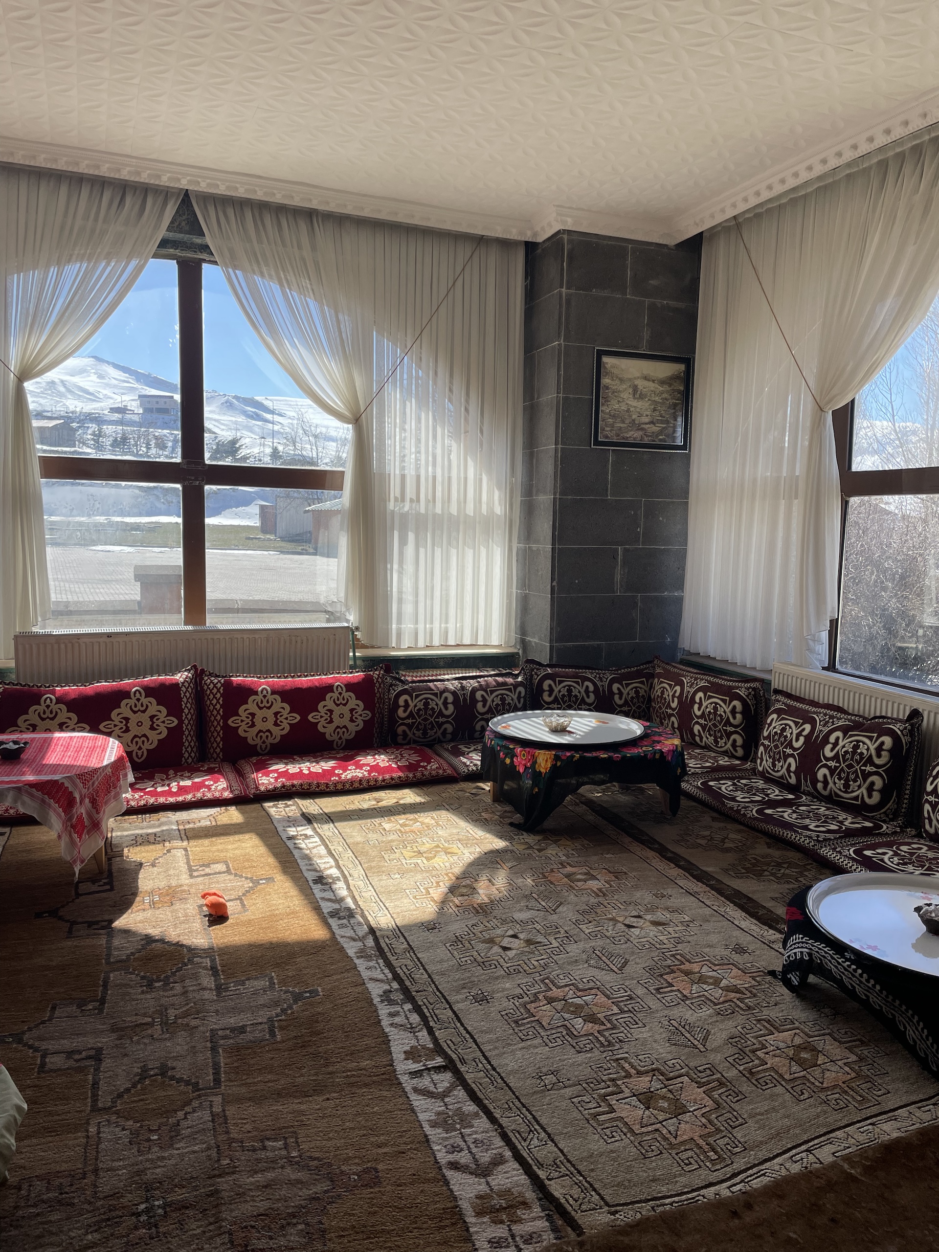 Η ξεναγός μάς δείχνει πού τέμνονται τα σύνορα τεσσάρων χωρών, πού τελειώνει η Τουρκία, πού ξεκινά η Αρμενία, πού το Ιράν και πού το Αζερμπαϊζάν. Το τοπίο χιονισμένο, τα χιόνια άλλωστε στο βουνό αυτό δε λιώνουν ποτέ από τα 4000 μέτρα και πάνω.