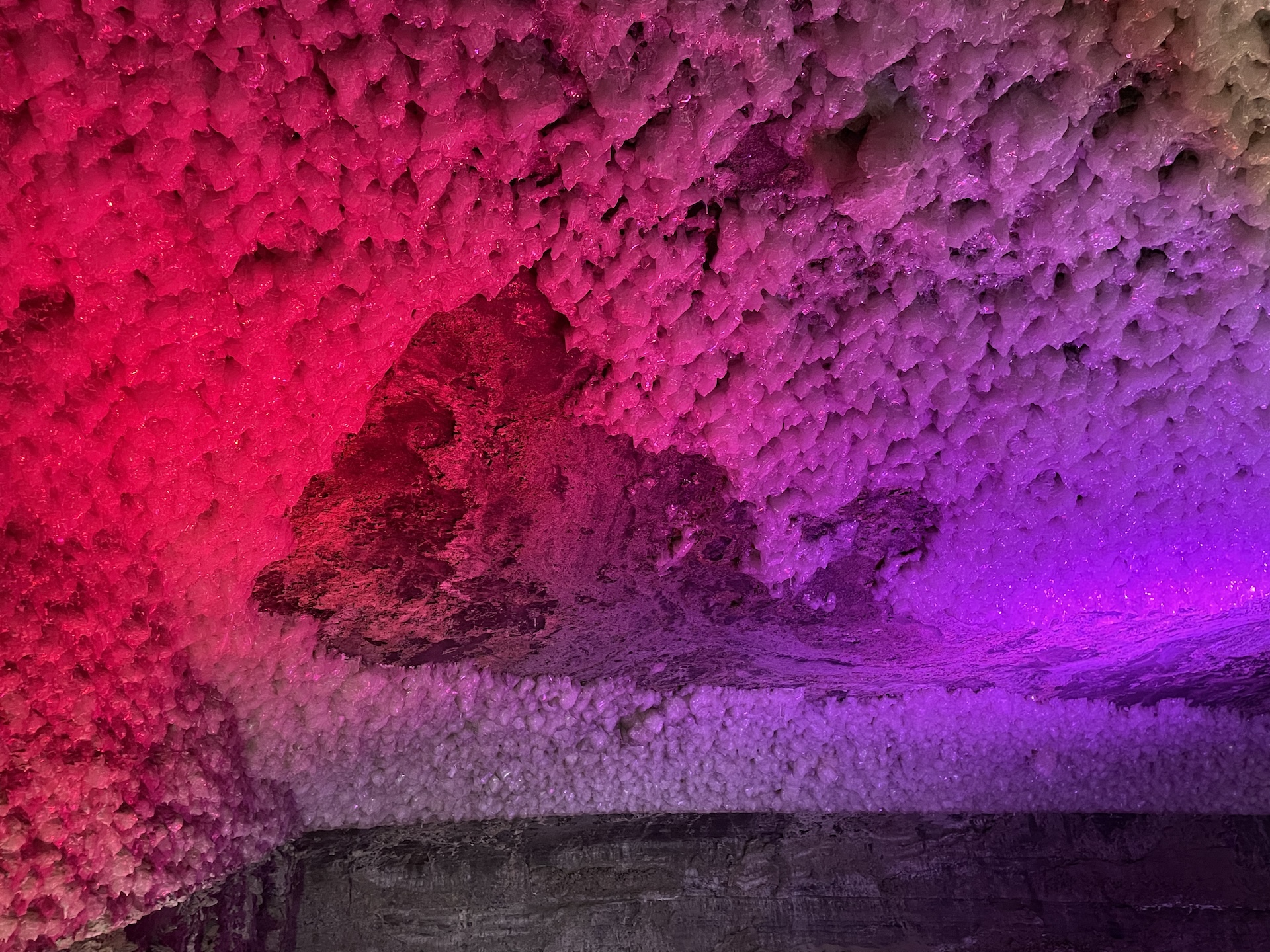Εκεί, μέσα στα σωθικά του βουνού είναι τρομερά περίεργο το πώς “βγαίνει” αλάτι. Περπατώντας στις σπηλιές και στις σήραγγες, ο αέρας είναι ξηρός και αλατισμένος, η θερμοκρασία είναι σταθερή. Μοιάζει με σπήλαιο με σταλαγμίτες και σταλακτίτες, μόνο που όλα εκεί μέσα είναι αλμυρά. Ο φωτισμός είναι εντυπωσιακός και το τοπίο τρομερά απόκοσμο. Η βόλτα μας καταλήγει σε μια αίθουσα φωτισμένη σε μωβ χρώματα, όπου εκεί οι αλάτινοι όγκοι είναι πραγματικά εντυπωσιακοί.