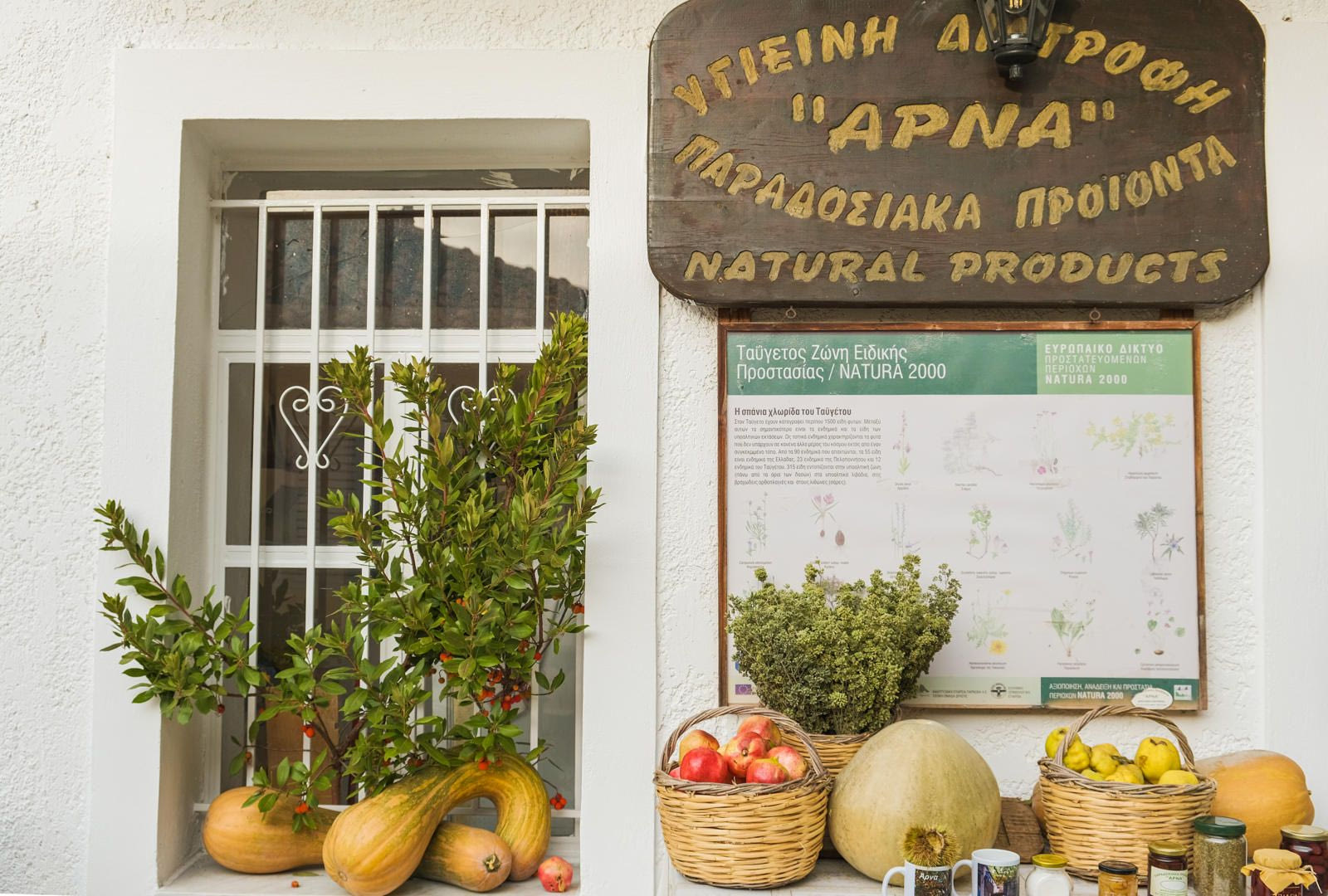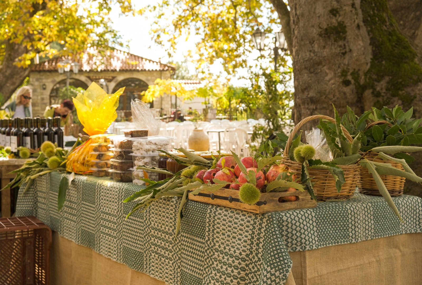 Πάνω και πρώτα απ’ όλα όμως η γιορτή του κάστανου είναι μια υπαίθρια αγορά ντυμένη με ξεχωριστή αισθητική. Κάτω από τα κλαδιά του γνωστού αιωνόβιου πλάτανου της Άρνας απλώνεται μια σειρά από καλοφτιαγμένους πάγκους ντόπιων παραγωγών, που φιλοξενούν μια πανδαισία από τοπικά, φθινοπωρινά προϊόντα. Μέσα στα πολυτάρια και τα κοφίνια, τα χρώματα από τα κάστανα, τα ρόδια, τα καρύδια, τα κυδώνια, τα μήλα, τις κολοκύθες, μπερδεύονται γλυκά με τα αρώματα από το μέλι, το καινούριο κρασί, τα γλυκά κουταλιού, τα αρωματικά φυτά του Ταϋγέτου.”