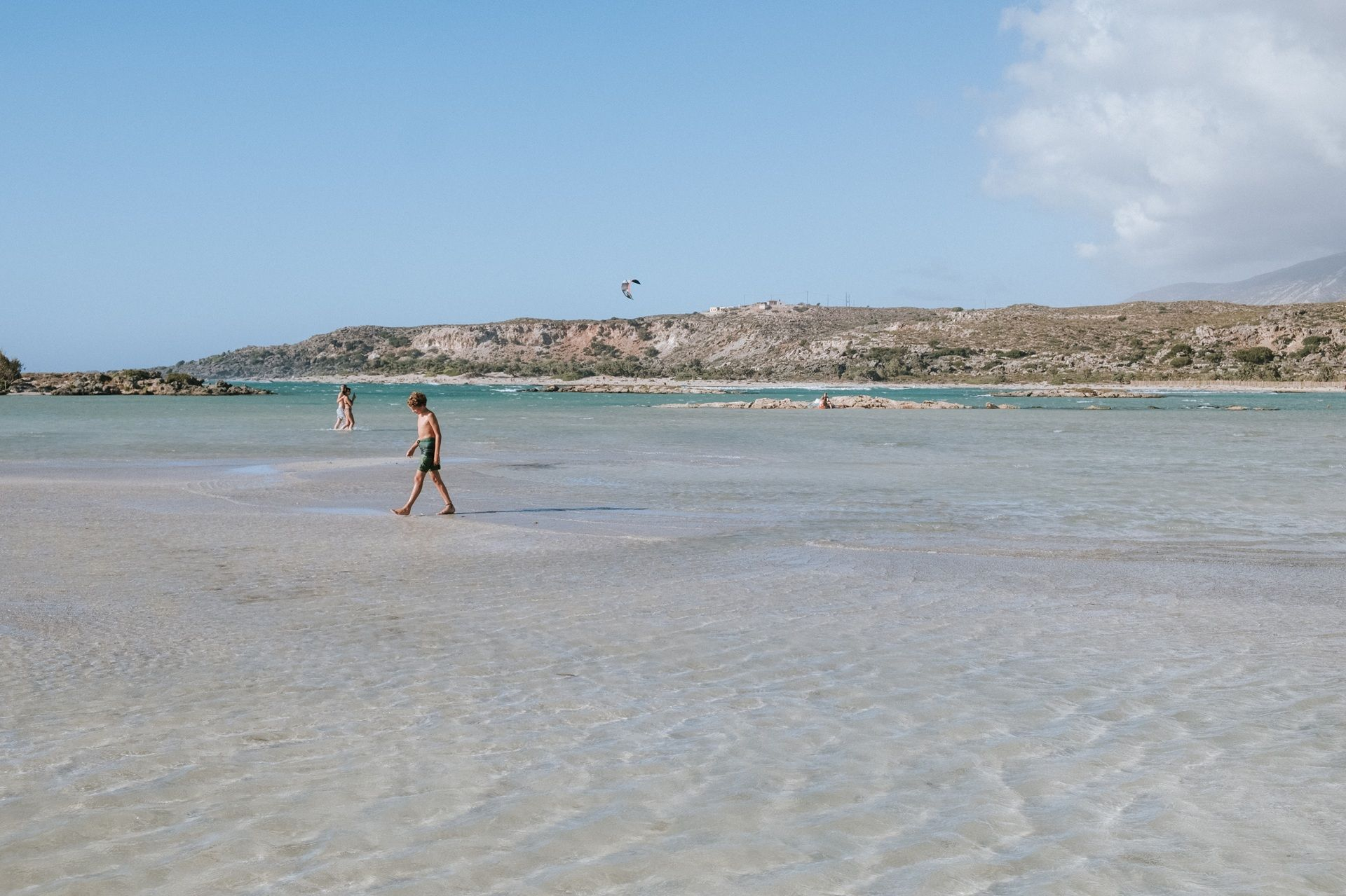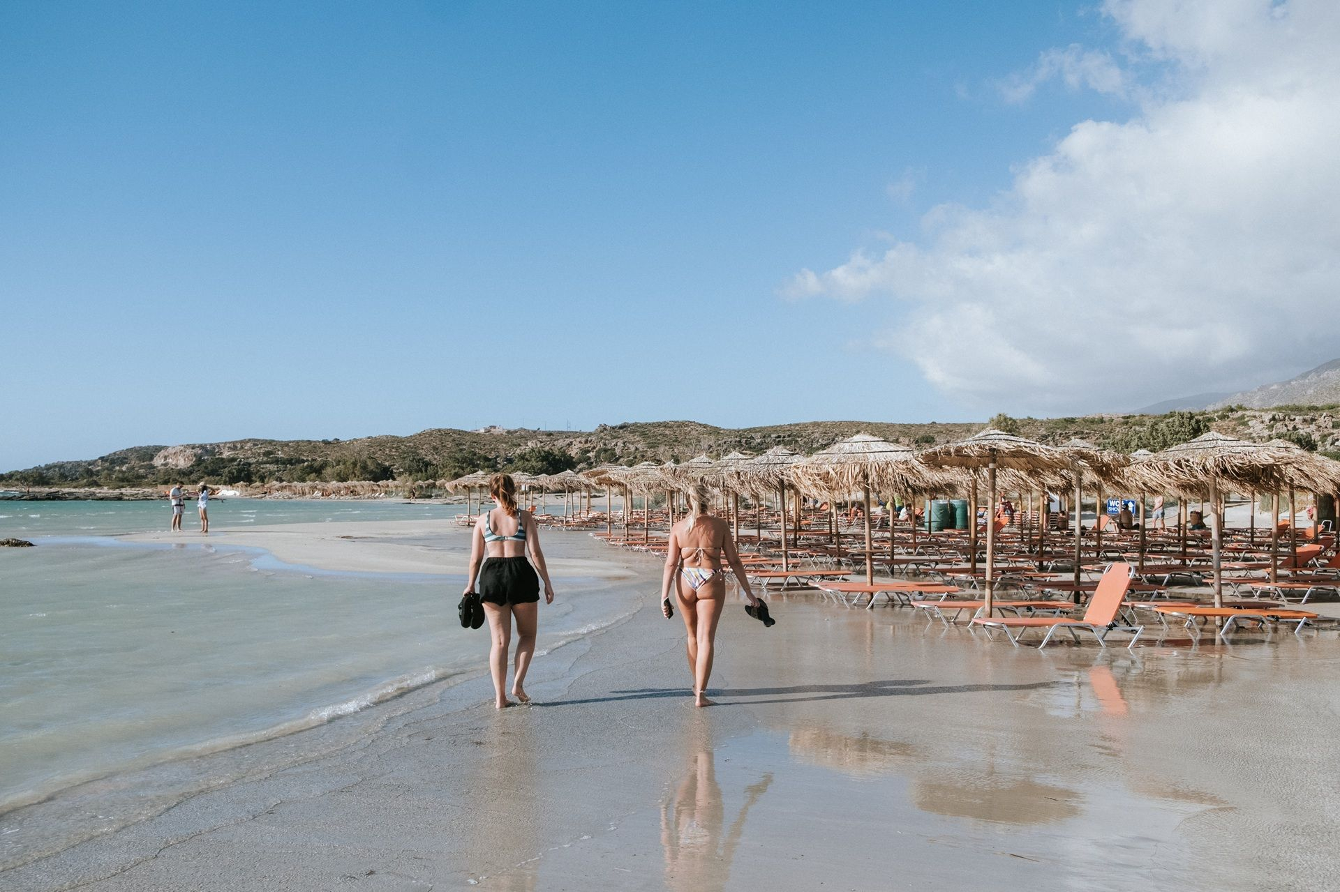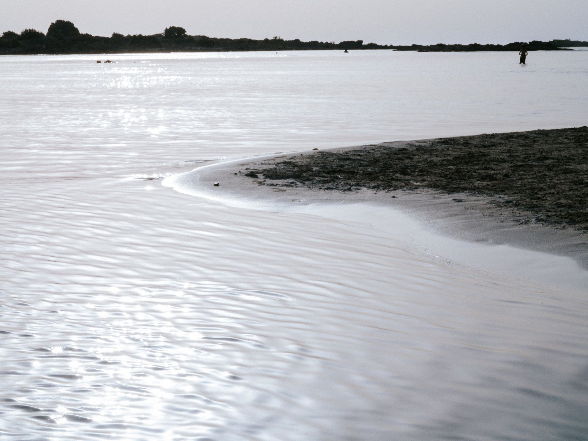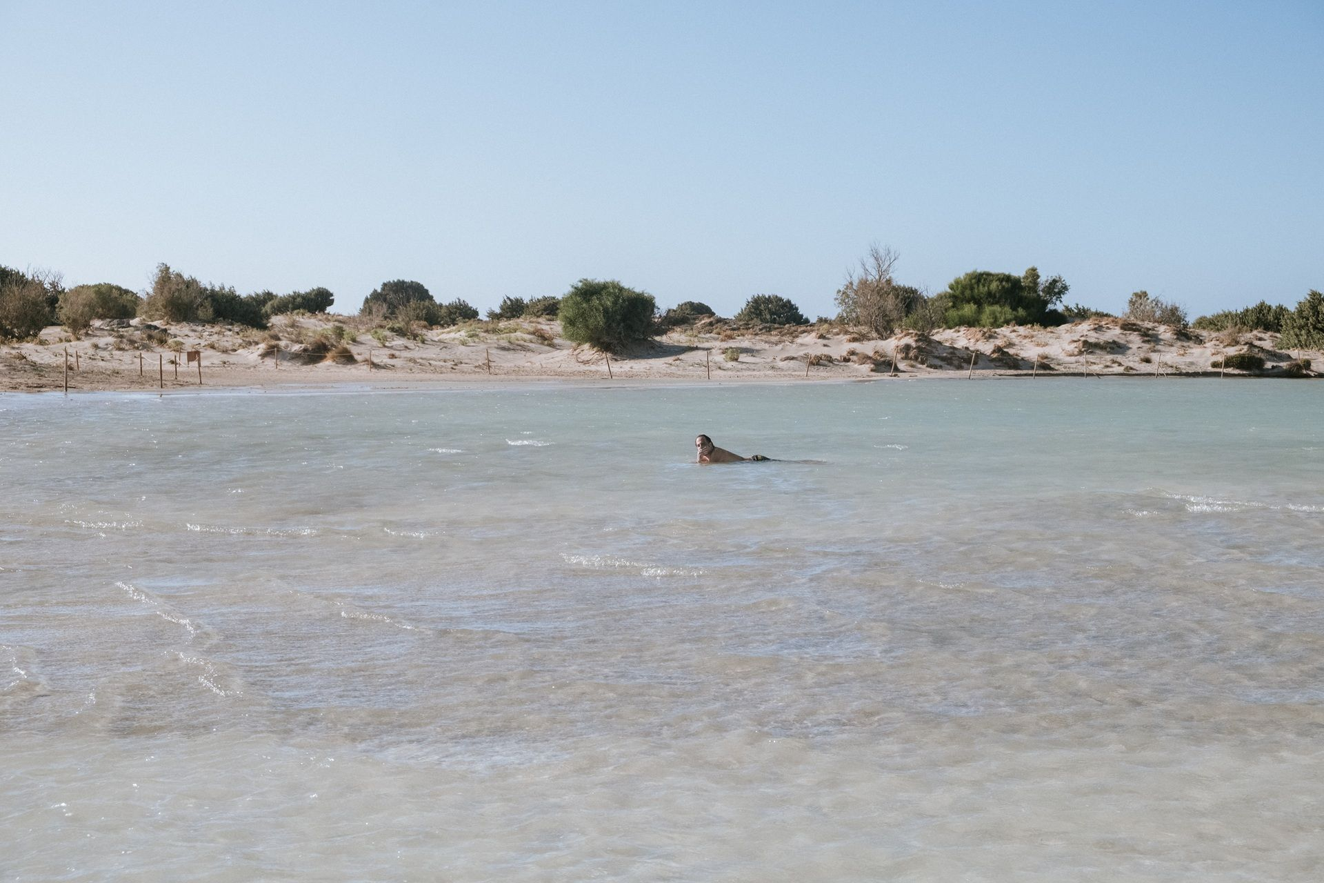 Αμμουδιές με λευκή και ροζ απόχρωση, που οφείλεται σε μικροσκοπικά σπασμένα κοχυλάκια (τρηματοφόρα), πλαισιώνουν τη χερσόνησο, συνθέτοντας ένα εξωτικό τοπίο που παραπέμπει στην Καραϊβική. Το σημείο όπου “σπάει” η χερσόνησος σχηματίζει μια λιμνοθάλασσα με βάθος που δεν ξεπερνά τα 50 εκατοστά, καθιστώντας την ιδανική για παιδιά. Οι επισκέπτες μπορούν με ασφάλεια να τη διασχίσουν πεζοί, μεταφέροντας μαζί τους ακόμη και τον εξοπλισμό τους.
