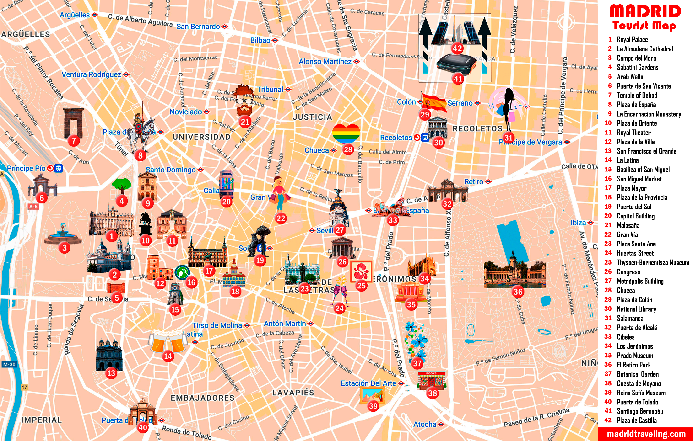 Τα αξιοθέατα της ισπανικής πρωτεύουσας είναι αναρίθμητα και καλύπτουν όλες τις εποχές. Πριν προχωρήσουμε όμως σε αυτά, θα ήταν χρήσιμο να σας “τοποθετήσουμε” πρώτα μέσα στην πόλη, με τη βοήθεια του χάρτη που βλέπετε ακριβώς από πάνω. Στο κάτω μέρος του και προς τα δεξιά (κάτω από τον αριθμό 38), βλέπετε την Ατότσα (Atocha), τον κεντρικό σιδηροδρομικό σταθμό της Μαδρίτης (και νότιο σύνορό της), από τον οποίο ξεκινάει η οδός Paseo del Prado. Ακολουθώντας τη προς τα βόρεια, φτάνουμε στο νούμερο 33, όπου συναντάμε την Plaza de Cibeles (εκεί βρίσκεται το ομώνυμο συντριβάνι της Κυβέλης, σημείο στο οποίο συγκεντρώνονται οι φίλοι της Ρεάλ Μαδρίτης για να γιορτάσουν τις μεγάλες νίκες της ομάδας τους). Από εκεί και μετά, ο δρόμος συνεχίζει προς τα βόρεια, πλέον με την ονομασία Paseo de Recoletos, μέχρι την Πλατεία του Κολόμβου (Plaza de Colón, στον αριθμό 29).