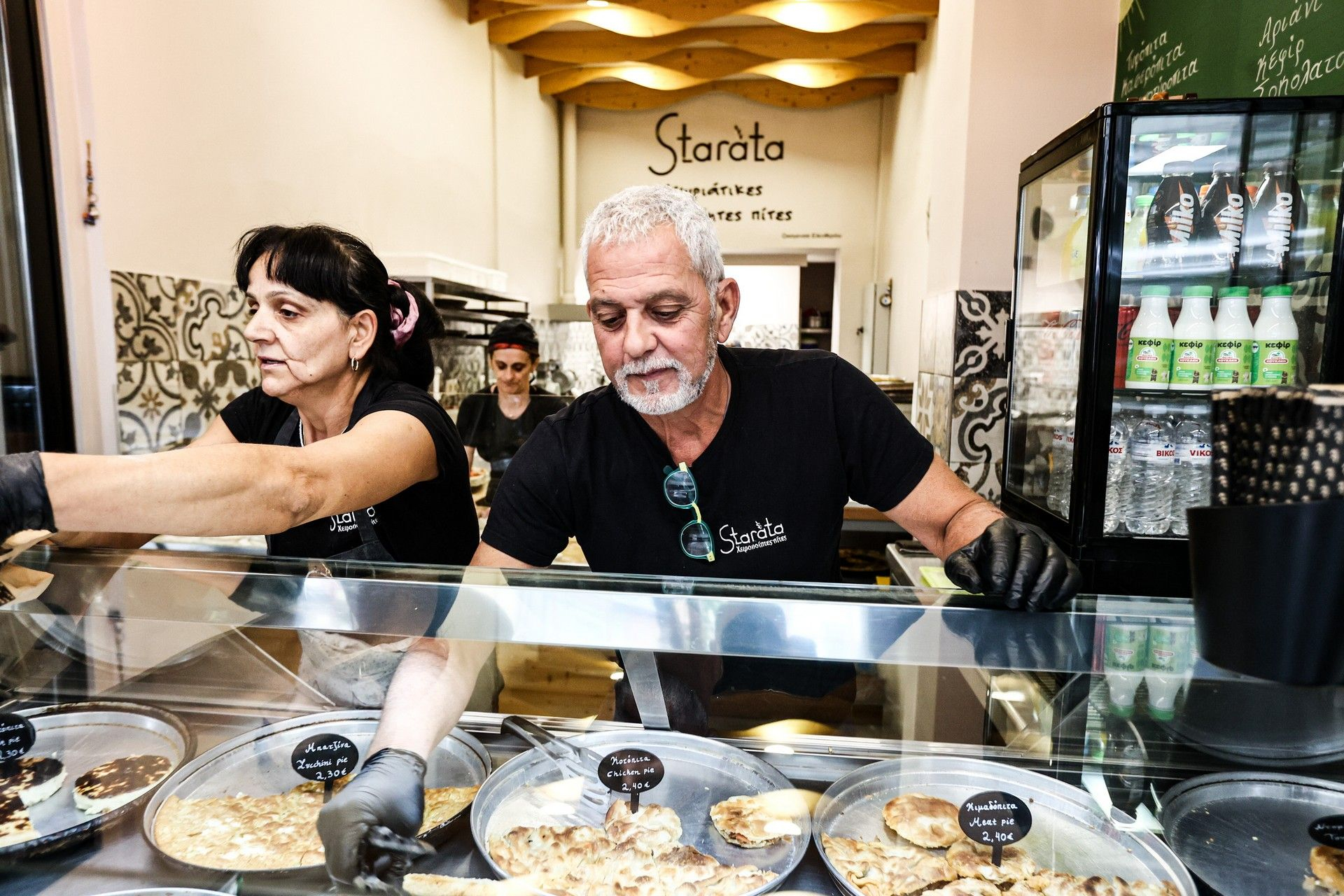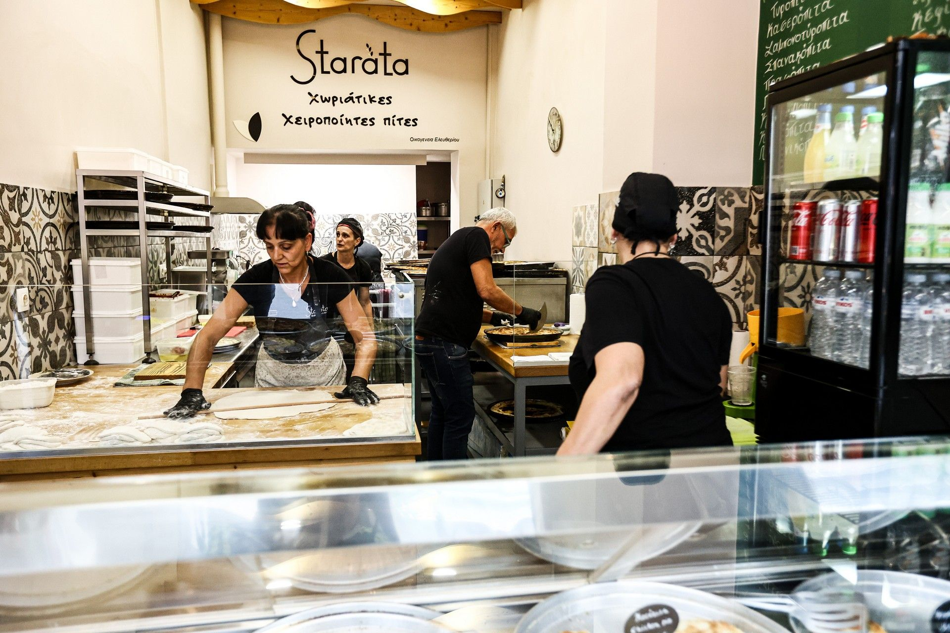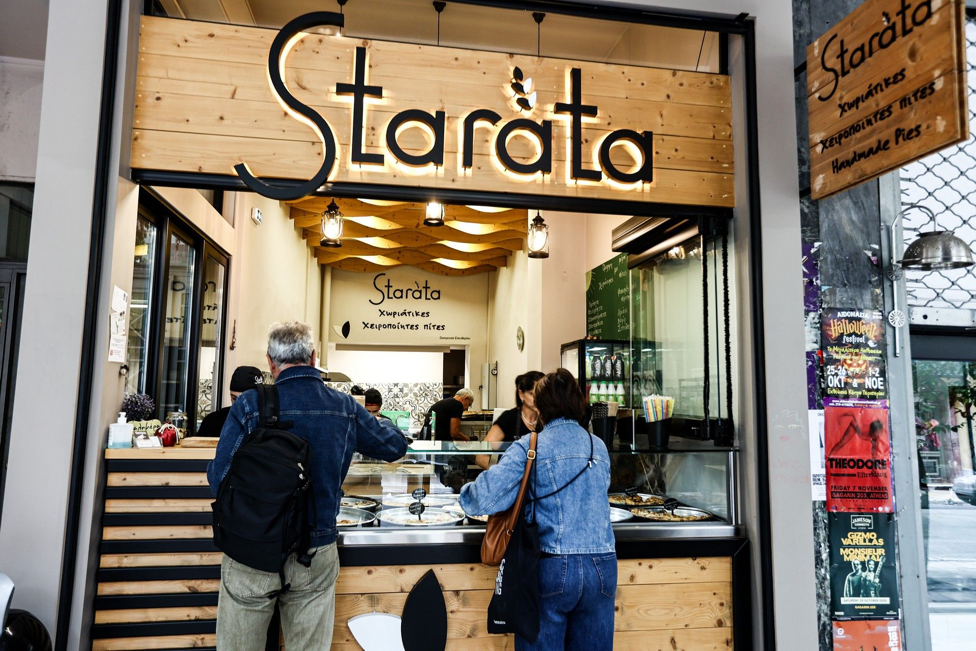 Στο Starata στη Χαριλάου Τρικούπη, η μέρα ξεκινά πολύ πριν ξημερώσει. Ο Μπάμπης και η Βάνα Ελευθερίου, που κατάγονται από την Καρδίτσα, ξυπνούν γύρω στις 4:00 το πρωί για να ετοιμάσουν τις πίτες τους, και φεύγουν κοντά στις 6:00 το απόγευμα, κουβαλώντας μαζί τους το ίδιο χαμόγελο με το οποίο πέρασαν το πρωί την πόρτα.