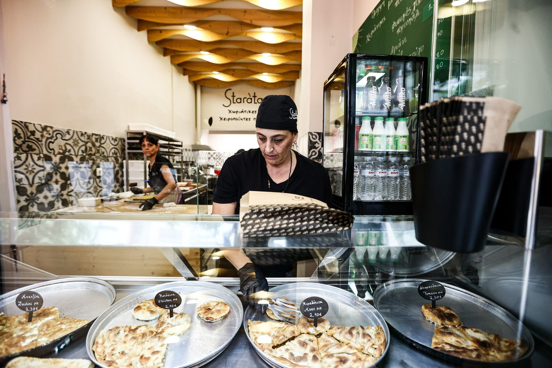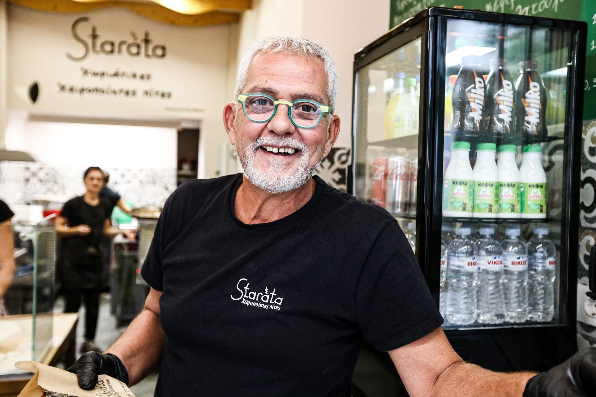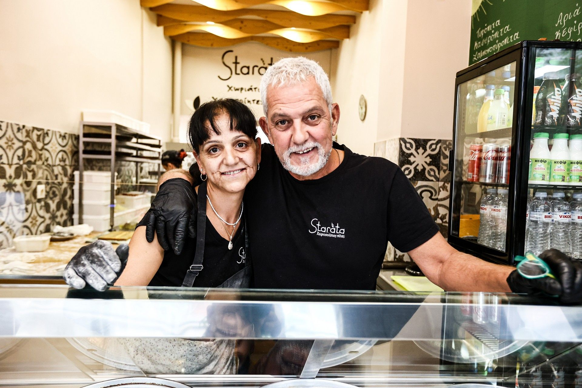 Στο Starata στη Χαριλάου Τρικούπη, η μέρα ξεκινά πολύ πριν ξημερώσει. Ο Μπάμπης και η Βάνα Ελευθερίου, που κατάγονται από την Καρδίτσα, ξυπνούν γύρω στις 4:00 το πρωί για να ετοιμάσουν τις πίτες τους, και φεύγουν κοντά στις 6:00 το απόγευμα, κουβαλώντας μαζί τους το ίδιο χαμόγελο με το οποίο πέρασαν το πρωί την πόρτα.