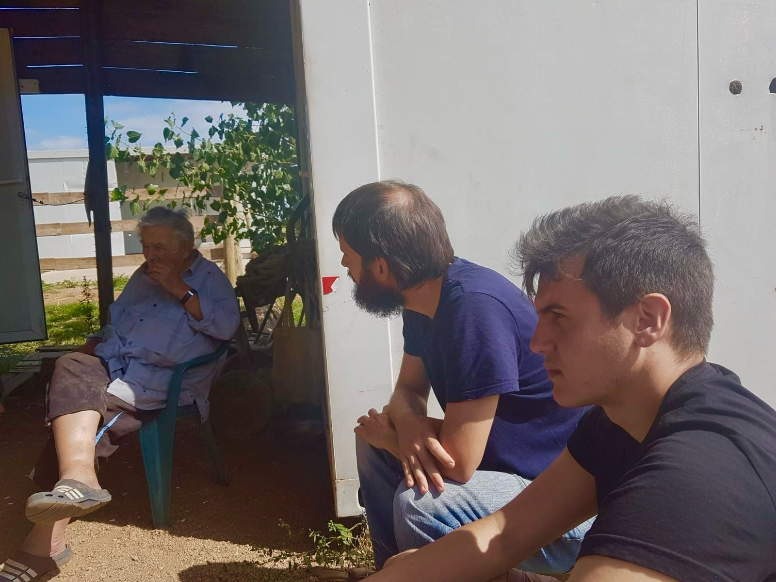 «Ξέραμε ότι δέχεται κόσμο, ότι είναι πολύ απλός, ξέραμε βέβαια ότι υπάρχει και ένα ρίσκο, ότι μπορεί να μην είναι εκεί. Αλλά λέμε πάμε να το δοκιμάσουμε. Καταφέραμε να εντοπίσουμε το αγρόκτημα στην περιφέρεια του Μοντεβιδέο, μάς άνοιξε ένας άνδρας και μας είπε πως ο Πέπε δουλεύει, περάστε μέσα αν θέλετε να τον περιμένετε και θα σας βρει μόλις τελειώσει» θυμάται ο Ιάσονας.