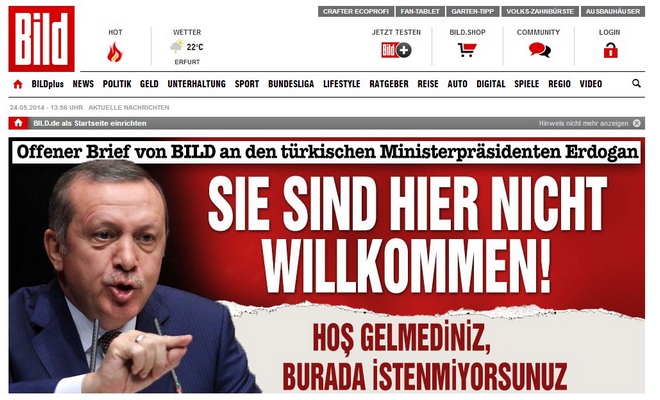 “Δεν είστε ευπρόσδεκτος εδώ”, είναι ο τίτλος ανοιχτής επιστολής που απευθύνει η γερμανική εφημερίδα «Bild» στον πρωθυπουργό της Τουρκίας, Ταγίπ Ερντογάν, ενόψει της αποψινής του ομιλίας στην Κολονία.