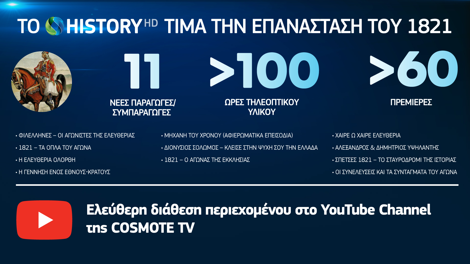 Στο πλαίσιο συμπλήρωσης 200 χρόνων από την Επανάσταση του 1821, το COSMOTE HISTORY HD έχει ετοιμάσει ένα πλούσιο αφιέρωμα με θέμα τον αγώνα για την ελευθερία, το οποίο αποτελείται από 11 νέες παραγωγές και συμπαραγωγές COSMOTE TV. Συνολικά, καθ΄ όλη τη διάρκεια της χρονιάς, οι τηλεθεατές θα παρακολουθήσουν πάνω από 100 ώρες τηλεοπτικού προγράμματος αφιερωμένου στην ελληνική Επανάσταση. Όπως ανακοίνωσε ο Πρόεδρος και Διευθύνων Σύμβουλος του Ομίλου ΟΤΕ, πρεμιέρες ντοκιμαντέρ του COSMOTE HISTORY HD για την ελληνική Επανάσταση θα διατεθούν ελεύθερα για όλους, μέσα από το κανάλι της COSMOTE TV στο YouTube.