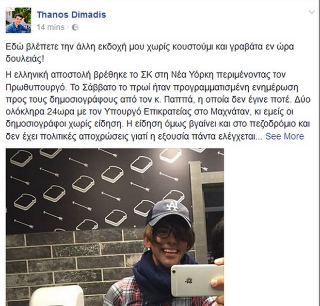 Σε μεταγενέστερο ποστ του μάλιστα ο δημοσιογράφος του STAR ανάρτησε φωτογραφίες του υπουργού από μια βόλτα του σε πάρκο της Νέα Υόρκης. “Αυτά κάνει ο κ. Υπουργός τρεις μέρες στο Μανχάταν! Χωρίς πρόγραμμα, χωρίς ατζέντα, χωρίς ΣΥΝΑΝΤΗΣΕΙΣ” σημειώνει και προειδοποιεί για ακόμη περισσότερες φωτογραφίες.