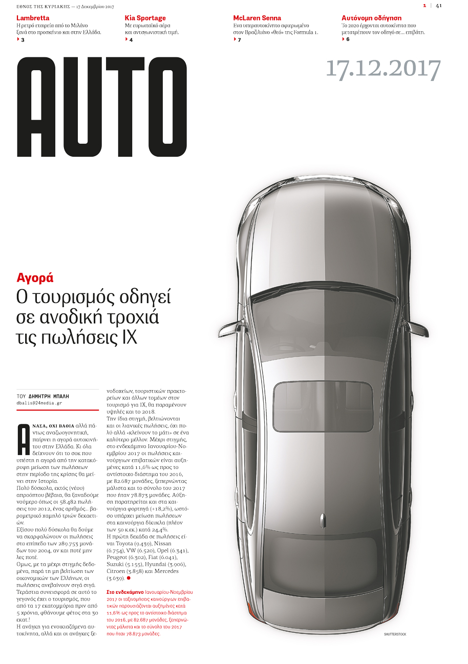Το πόδι στο γκάζι και αυτή την Κυριακή με θέμα για τον τουρισμό που οδηγεί σε ανοδική τροχιά τις πωλήσεις ΙΧ. Ακόμα: Κia Sportage με ευρωπαϊκό αέρα και ανταγωνιστική τιμή αλλά McLaren Senna, το υπεραυτοκίνητο που είναι αφιερωμένο στον Βραζιλιάνο θεό της F1.
